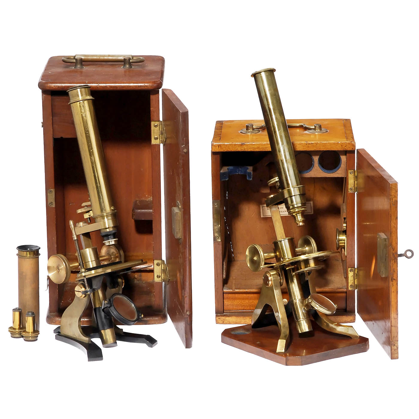 1) Society of Arts type microscope, unsigned, c. 1870, original lacquered and black-japanned brass, tilting stand, plano-concave mirror, substage diaphragm wheel with four stops, rack-and-pinion coarse focusing (defective), nosepiece micrometer knob fine focusing, mechanical stage with Alfred White-type "joystick" lever adjustment, height 13 in., with one objective lens by R.J. Beck and one eyepiece in mahogany case. – Note: The design for this English bar-limb microscope dates to a prize that was offered by the Royal Society for the Encouragement of Arts, Manufactures & Commerce, for a compound microscope that would sell for 3 guineas only and was awarded to the firm of Robert Field & Son of Birmingham. Because of the popularity, it was copied by many of the instrument builders of the time. – And: 2) Signed on the base "S. Maw. Son & Thompson, London", c. 1880, polished brass, concave mirror, substage diaphragm wheel with three stops, tilting stand, rack-and-pinion coarse focusing, nosepiece micrometer knob fine focusing, mechanical stage, one eyepiece, one objective lens, height 13 in., with live box and forceps in mahogany case, lower section with drawer for specimen slides.
