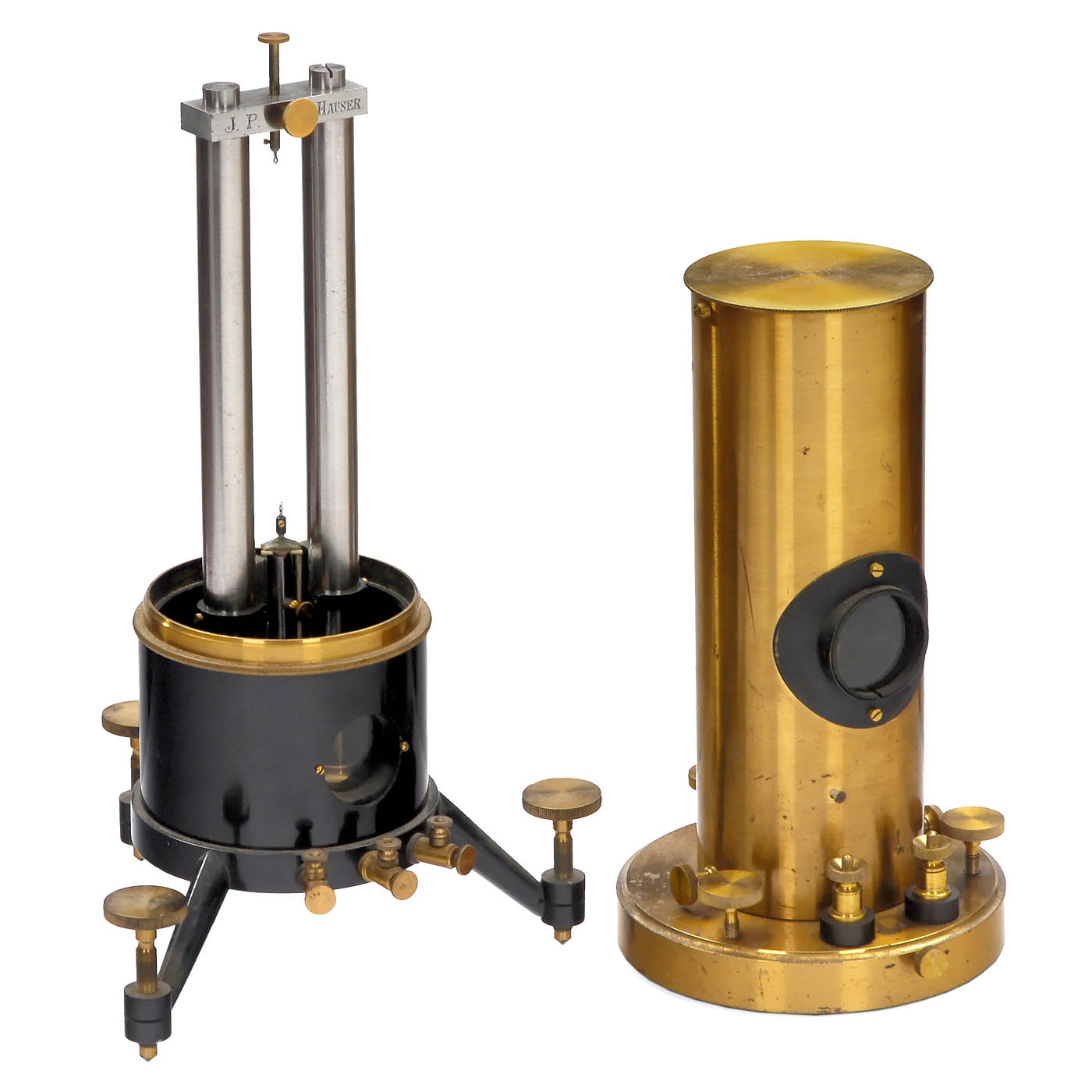 1) Mirror galvanometer, Nalder Bros & Co, Westminster, original lacquered brass, height 10 4/5 in. – 2) Torsion galvanometer, Siemens & Halske, Berlin, after Dr. O. Fröhlich, No. 1961, one of the first instruments for measuring direct current in Danielle, mahogany base, original lacquered brass parts, in glass cylinder, height 8 3/4 in., thread missing. – 3) Mirror galvanometer, J.P. Hauser, ebonised and original lacquered brass, without glass cover, height 5 3/4 in. – 4) Physical instrument, Griffin & Tatlock Ltd, London, exact function unknown, 2 electrical connections, 2 interconnected closed glass cylinders, filled with liquid and crystals, under glass cover, height 6 1/2 in. – And: 5) Needle galvanometer, unmarked, fruitwood base, silvered scale, needle on long cocoon thread, under glass dome, height 10 1/2 in.
