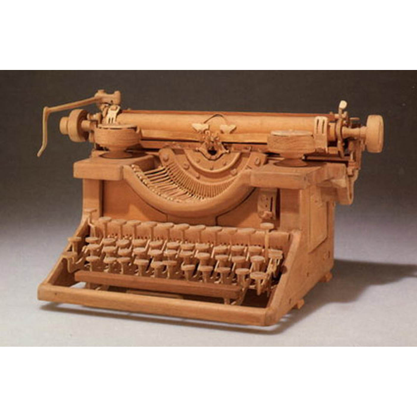 Static linden wood sculpture of a treadle sewing machine with carved "Singer" plaque, bobbins, fretwork treadle, drive-belt and wheel, on serpentine base with drawer-fronts, wd. 30 ½ x dp. 16 ½ x ht. 37 in. (78 x 42 x 94 cm). – Accompanying the sculpture is an 8 x 11 in. press photograph of Yoshimura standing before this sewing machine sculpture in his studio, the reverse with pencil inscription: "Fumio Yoshimura, husband of Kate Millet" and press stamp from "The Observer" newspaper, 24. January. – Heralded by the "New York Times" as "Sculptor of (the) Everyday", Fumio Yoshimura (1926–2002) was born in Japan and studied painting at the Tokyo University of Arts. After moving to New York in 1963, Yoshimura taught himself wood carving with an assortment of chisels, knives and drills. He established his own studio and created detailed sculptures of ephemeral life, such as flowers and food, as well utilitarian items – typewriters, motorbikes, machines – which he reproduced on a 1:1 scale in unfinished linden wood. – In 1965 Yoshimura married the prominent American feminist author, artist and activist Kate Millet, whose 1970 work "Sexual Politics" is dedicated to him. – Though he never depicted people in his work, the "New York Times" notes that "human activities are often implied in objects like an apple peeler (containing) a half-skinned piece of fruit". The simple, pared-down lines of Yoshimura's everyday items, which he described as representing the "ghosts of the original objects", are reminiscent of the Pop Art movement and the functionalism of Andy Warhol. – Yoshimura's sculptures are to be found in the collections of national museums, including the Philadelphia Museum of Art, the Hood Museum of Art at Dartmouth College and the Norton Museum of Art in West Palm Beach. – A beautiful work by a significant modern artist.