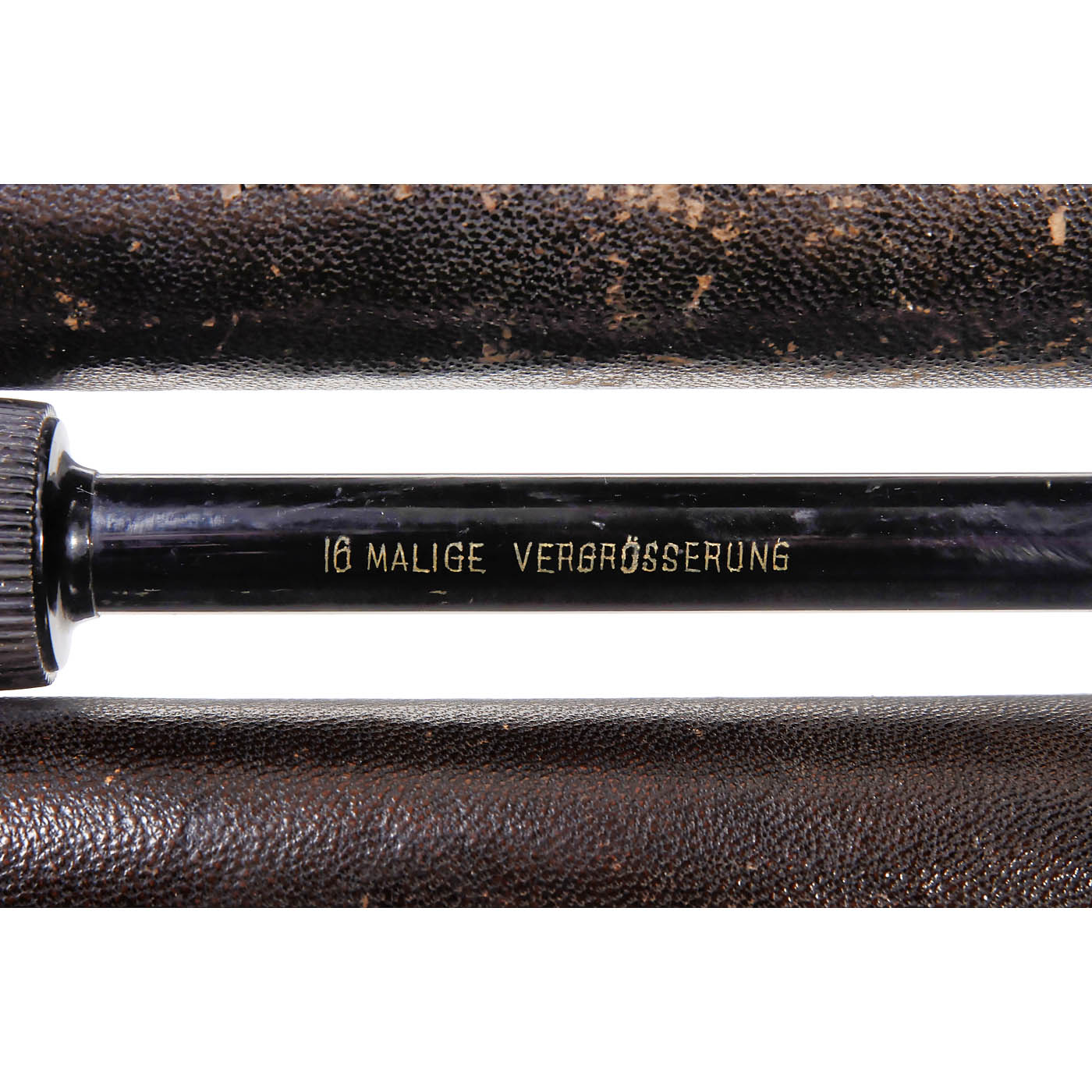 Inscribed on the eyepieces "Haase & Wilhelm, Prag", sixteenfold magnification (engraved on central driveshaft), black-lacquered brass, leather-covered tubes and eyepiece-mounts, bridge between the ob-jectives with inset compass, length extended 14 in., very clear image. A rare design, in very good original condition.