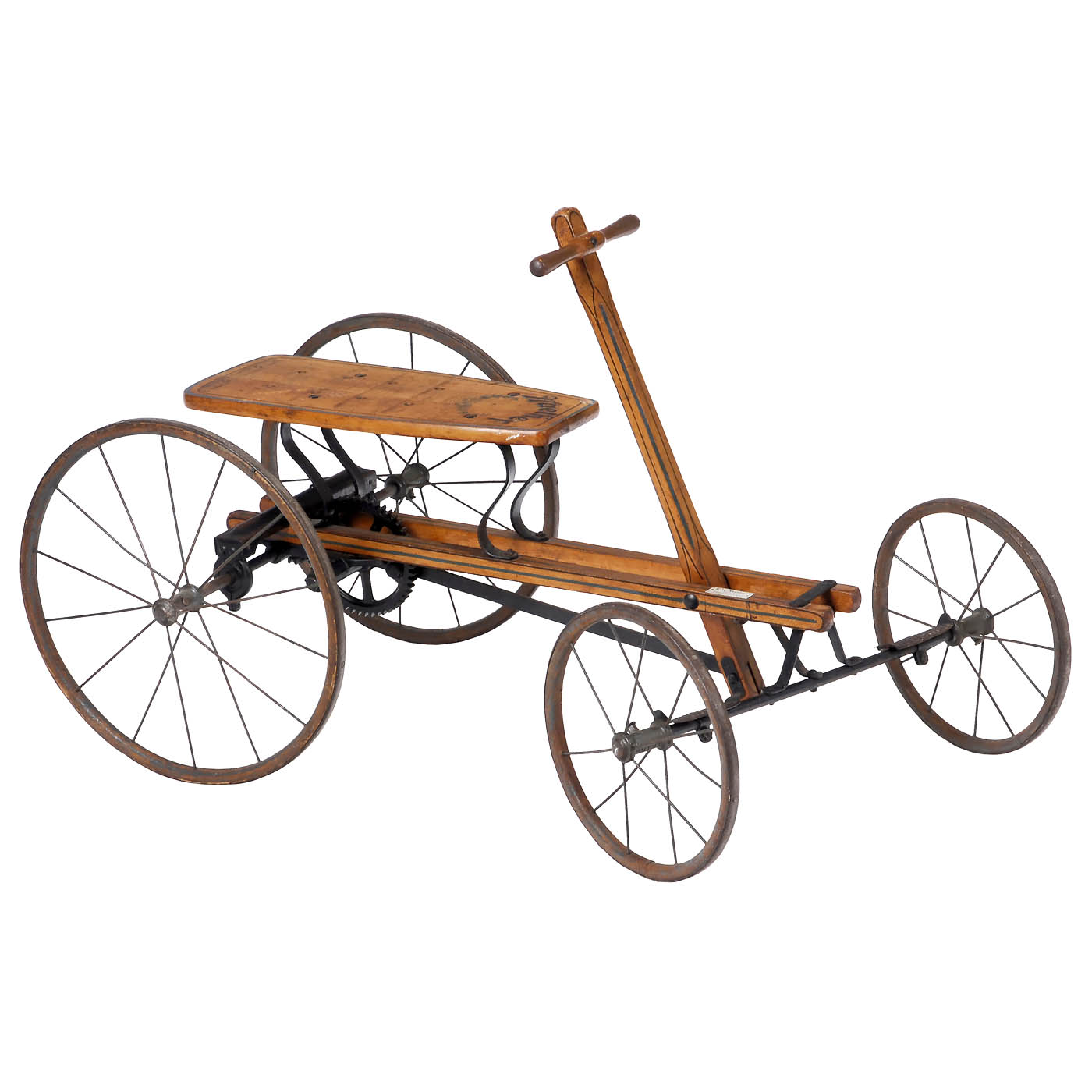 Ernst Albert Naether, Zeitz. German toy cart, powered by arm movements, foot-operated steering via the front axle, spoked wood wheels with iron tyres, length 43 in., ingenious.