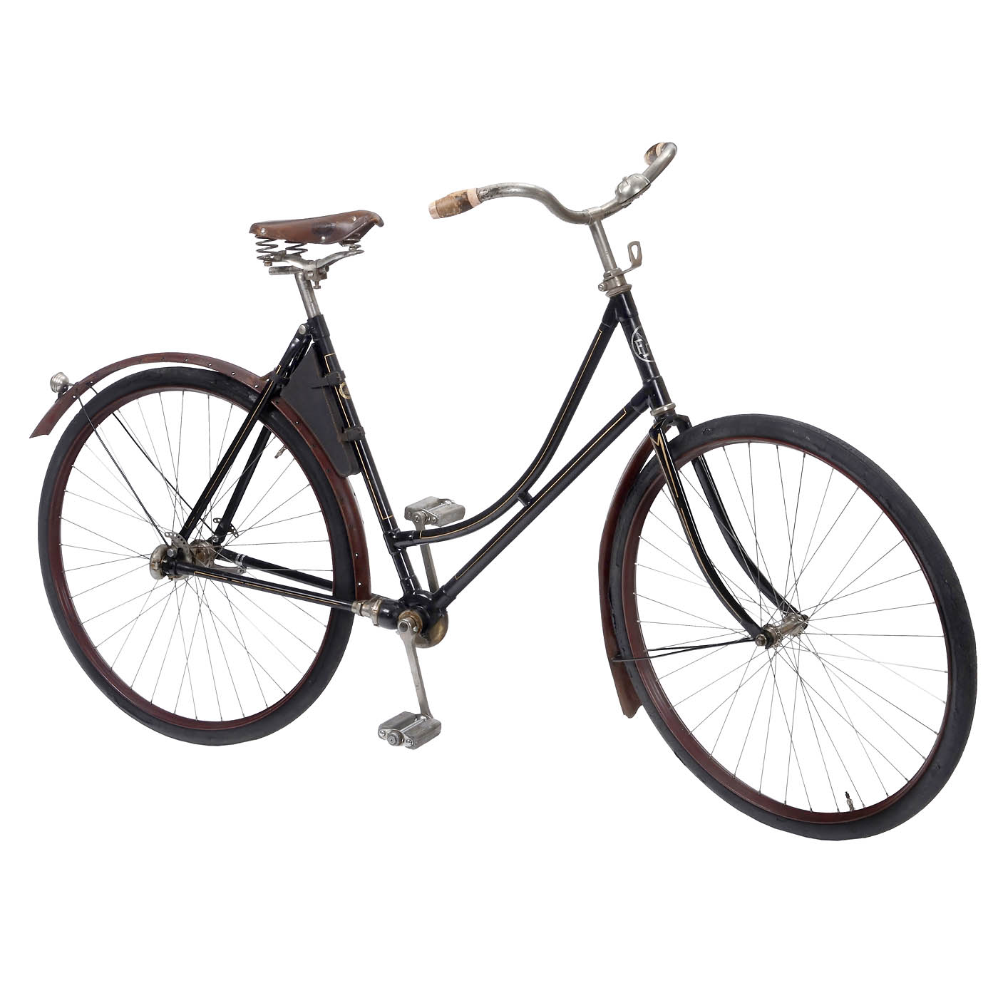 Fabrique Nationale (FN), Belgium. Serial no. 29572 stamped in the frame, Norma leather saddle, 28-inch wheels, small leather tool bag, good working condition. – Note: FN Herstal originated as an association of Liège gun manufacturers. In the mid-1890s, the company looked for other areas of production and in 1896 began manufacturing its own line of bicycles, including the "Acatene", a chainless, shaft-driven bicycle. The company remained a popular manufacturer of bicycles for about 30 years.