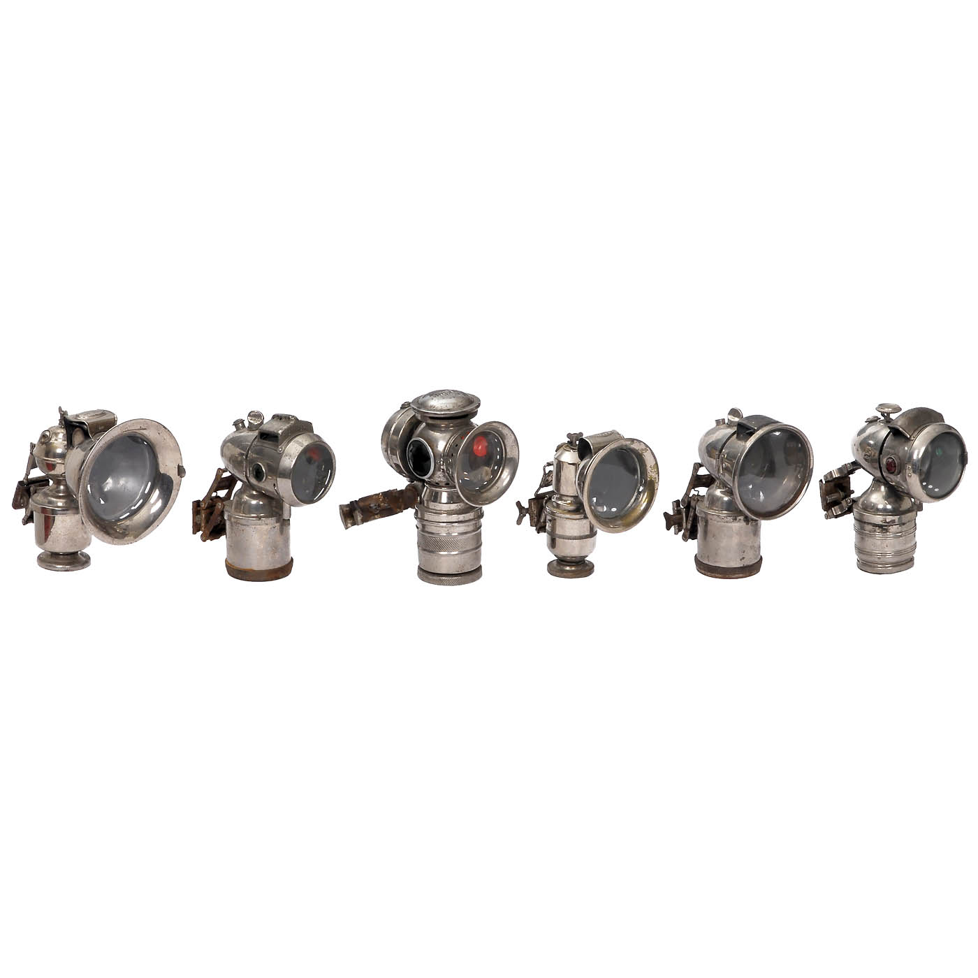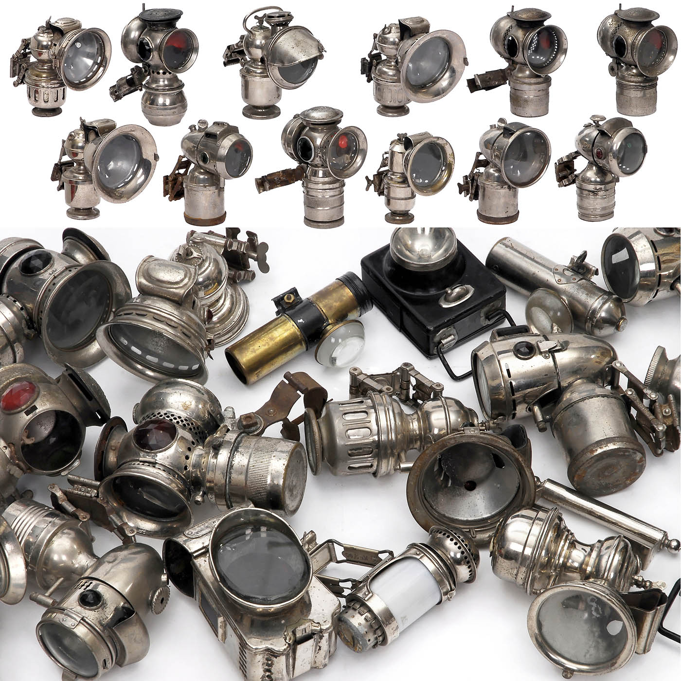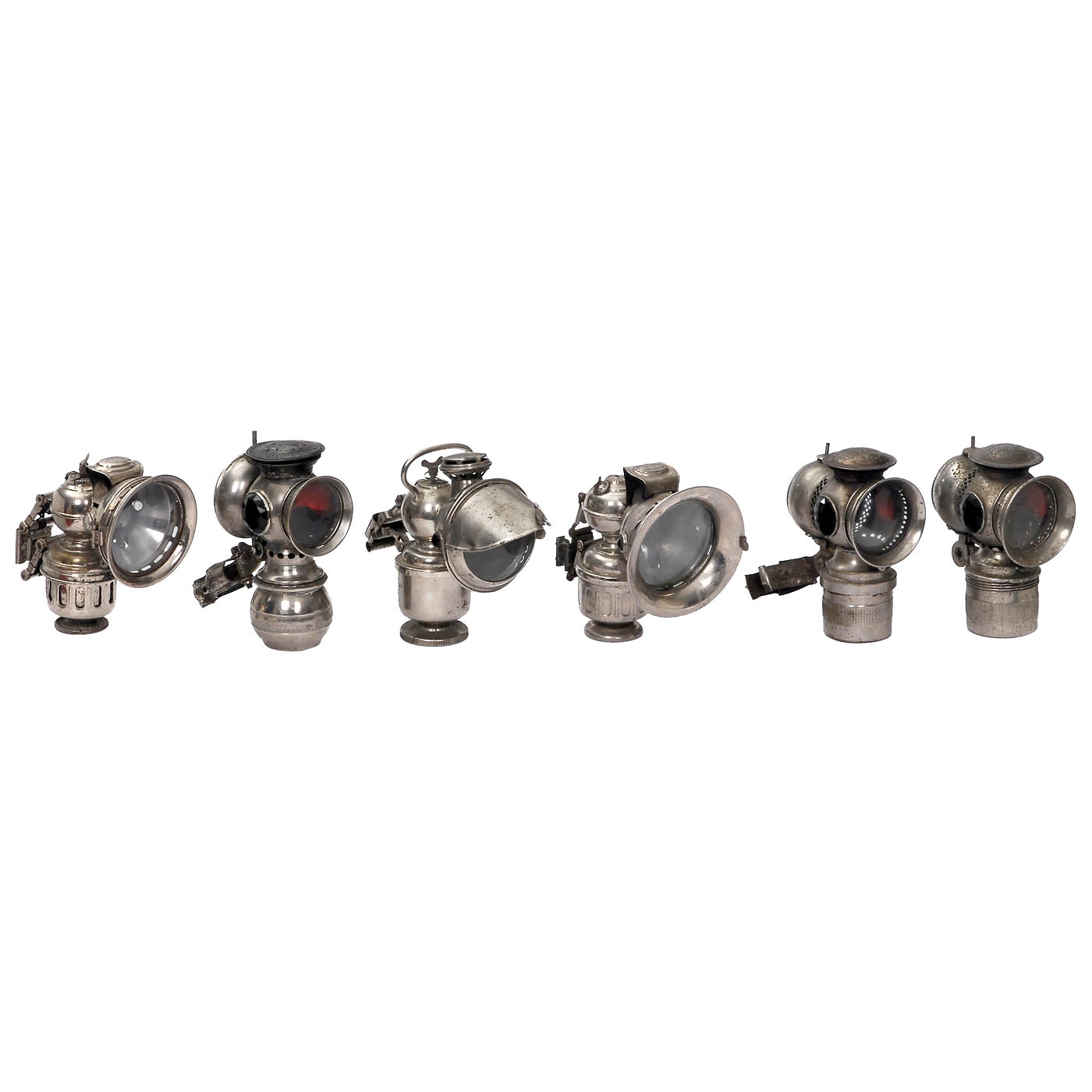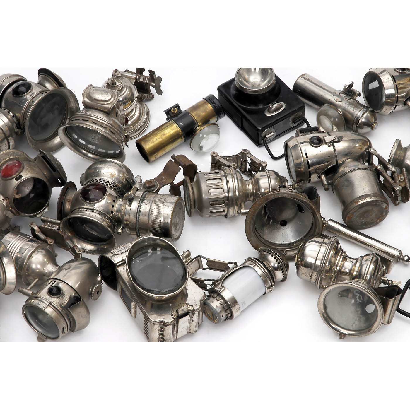 Nickel-plated brass, some with colored glass stones on the sides, 10 with brackets, with the following models: Obermetall, 2 x Radsonne, 2 x Impex, Riemann's Phaenomen, Diamant, Brilliant, Solar, Hasag and 2 x unmarked. – In addition: 27 further lamps with missing parts or damage (16 x acetylene, 6 x electric, 3 x candle and 2 x petroleum).