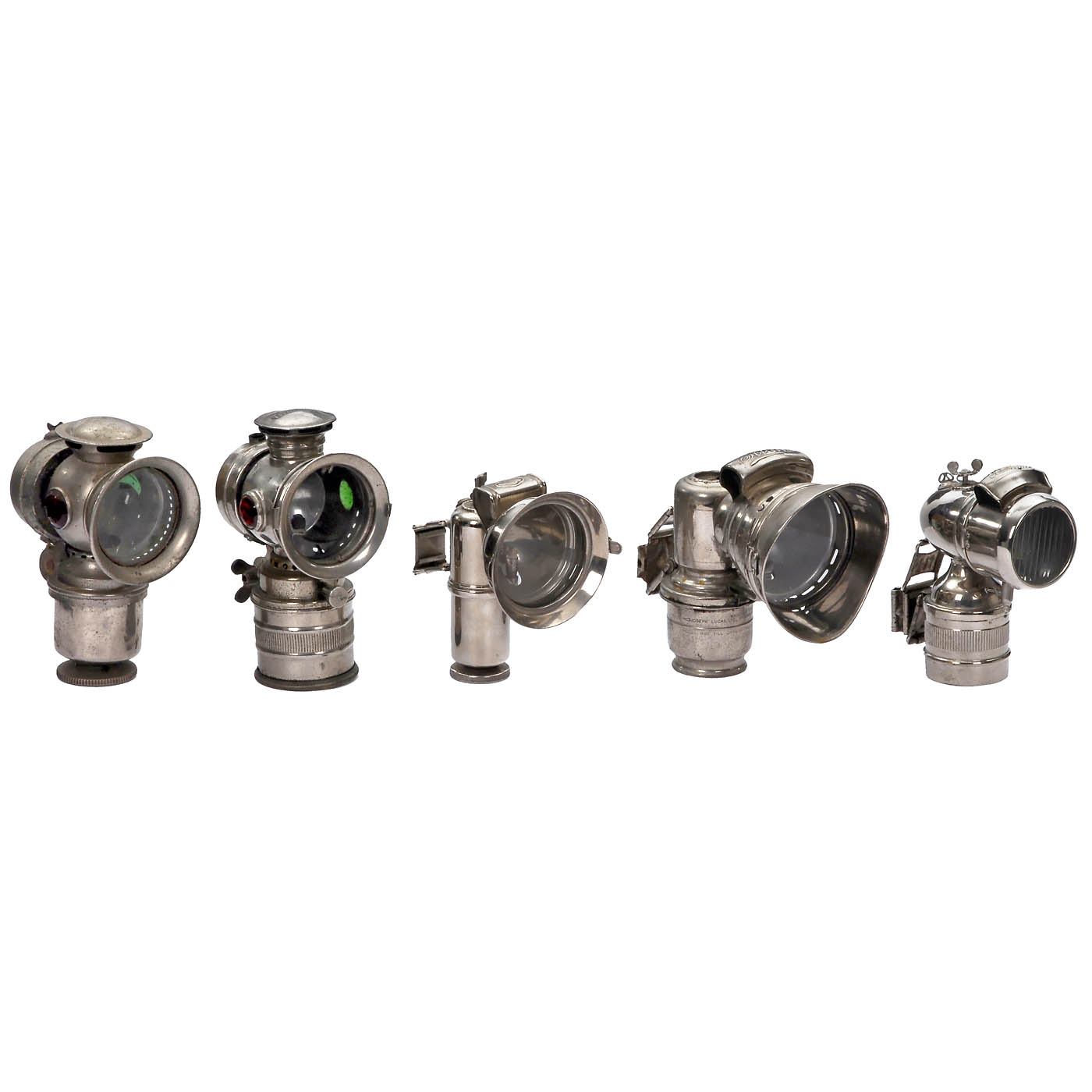 Nickel-plated brass, some with colored glass stones on the sides, 6 with brackets, following models: Vitaphare, Baby, Impex, 2 x Hassia, Radsonne, Diamant (missing glass and mount), Mirrora by Joseph Lucas and 2 unmarked lamps.