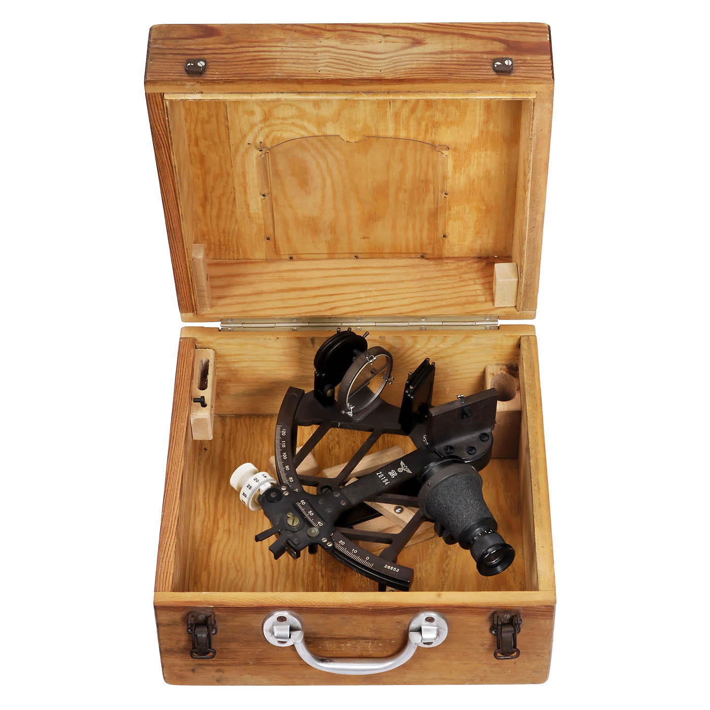 C. Plath, Hamburg. Made in the last year of World War II. without impressed manufacturer's logo, index arm stamped with eagle and swastika over Runic M, no. 20194, the arc with Plath serial no. 26252, with approx. 5x magnifying viewfinder telescope, index and horizon mirrors, four index filters and three horizon filters, the measuring range on the scale is -5 to +125 degrees, in original pine carrying case with aluminium handle, optics clear, all parts are working smoothly, near-mint condition. – Note: Owing to the scarcity of materials in 1945, the frame of this very late sextant is made of black and brown-painted aluminum, with a bakelite handle and plastic micrometer button.