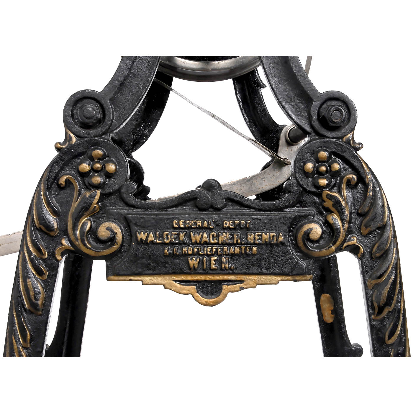 Dr. Gaertner Patent Ergostat, manufacturer: Waldek, Wagner & Benda, purveyor to the court, Vienna. Device to determine physical performance, change of crank friction by adjusting the weight, counter for the revolutions, with bell, heavy cast-metal frame, height 46 ½ in., working.