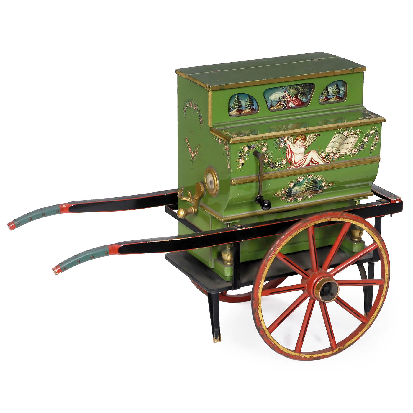 Faventa, Barcelona, España. Serial no. 8577, barrel with 6 melodies (popular German songs), 23 keys, cast-iron frame, crank-operated, tune-change crank with indicator, brighltly painted wood case, overall size 19 ¾ x 11 x 18 in. On matching handcart. – Playing condition, in need of tuning.