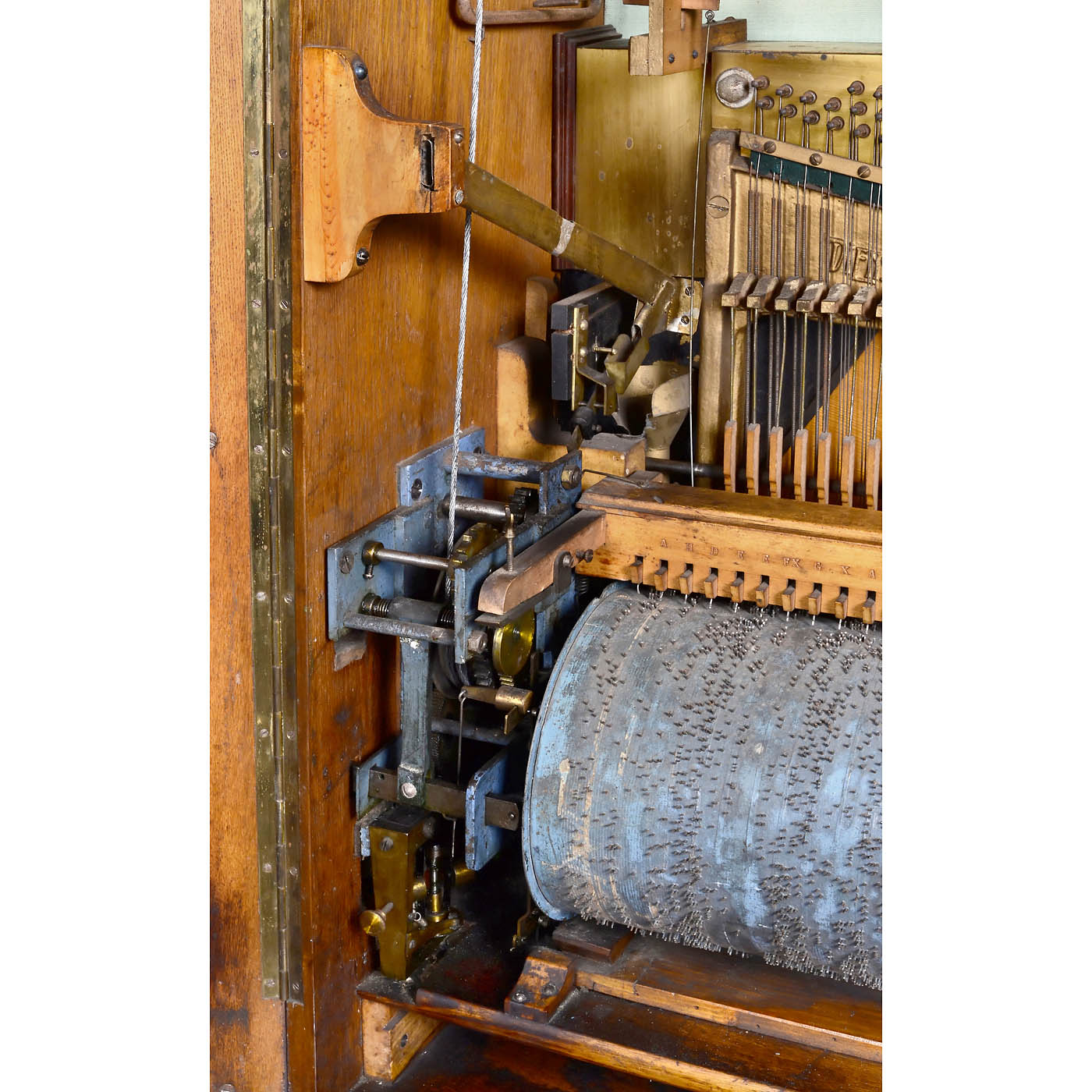 No. 449, E. Dienst & Co., Leipzig, coin-operated, weight-driven, playing 9 airs, with 35-key piano, rotating mandolin, cymbal, drum and triangle. two lithographs in front glass doors, complete dimensions 41 x 21 x 95 in. Good original working condition.