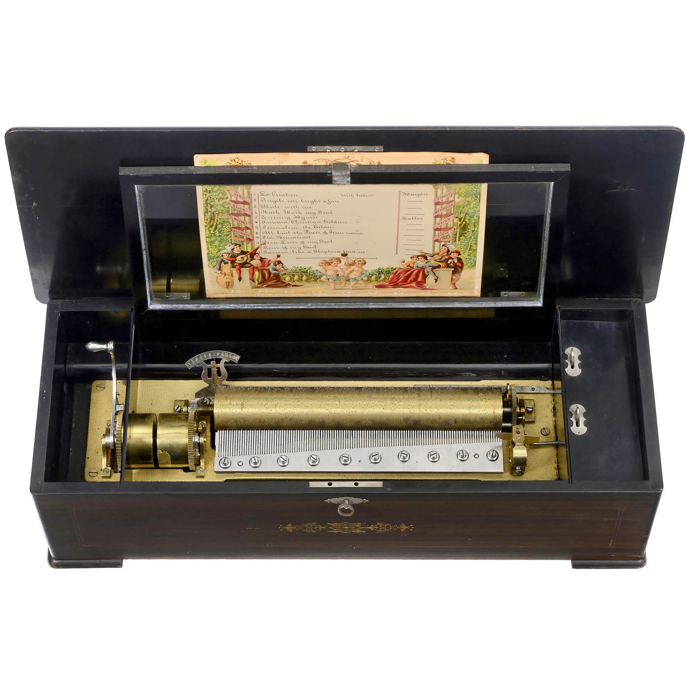Playing 12 hymns including "La Creation", "Jerusalem the Golden" and "Saviour like a Shepherd lead us". With 124 teeth (62 of them sounding teeth) in alternate-tip comb, governor-cock stamped "M.M.C.", tune-sheet with banner of "J.M. & C.", grained case with transfer-decorated front and inlaid floral motif on the veneered lid, wd. 28 in. (72 cm), cylinder 13 in. (33 cm). Case with original finish, movement in good playing condition. – An unusual format and program!