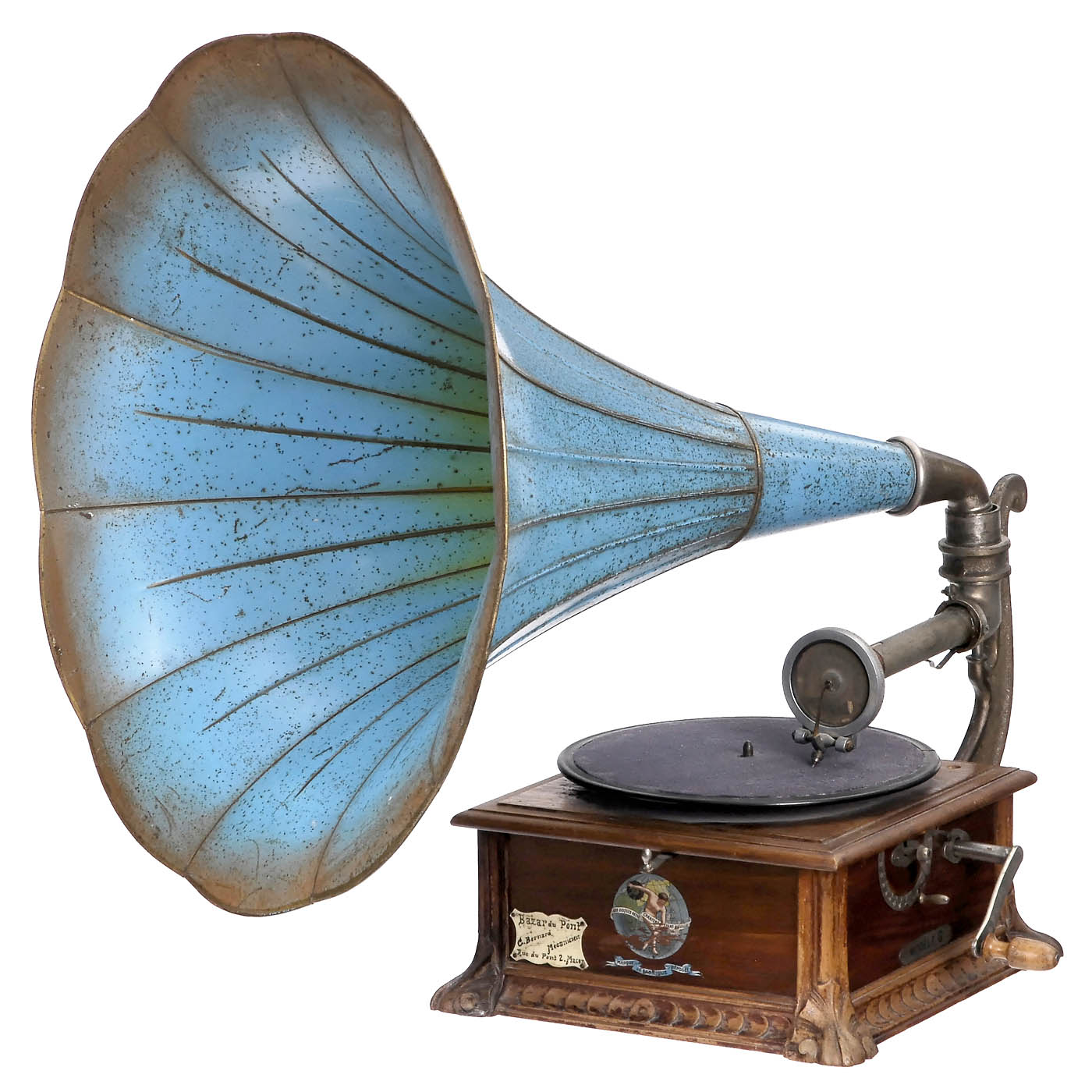 Pathé, Paris. For vertically-cut discs, walnut case with four carved lion’s paw feet, Pathé Concert reproducer (with sapphire), metal horn (mount somewhat large), spring-motor working.