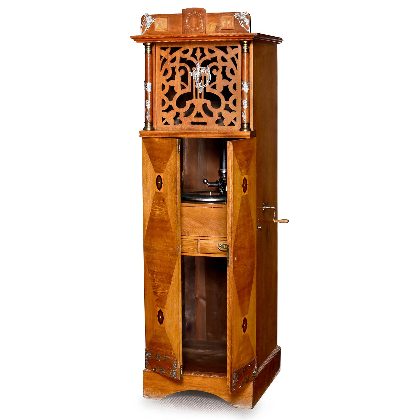 Former coin-operated model, unmarked, light-oak case with Art-Nouveau fittings and Goldring reproducer,20 ½ x 23 x 74 in., good working condition.
