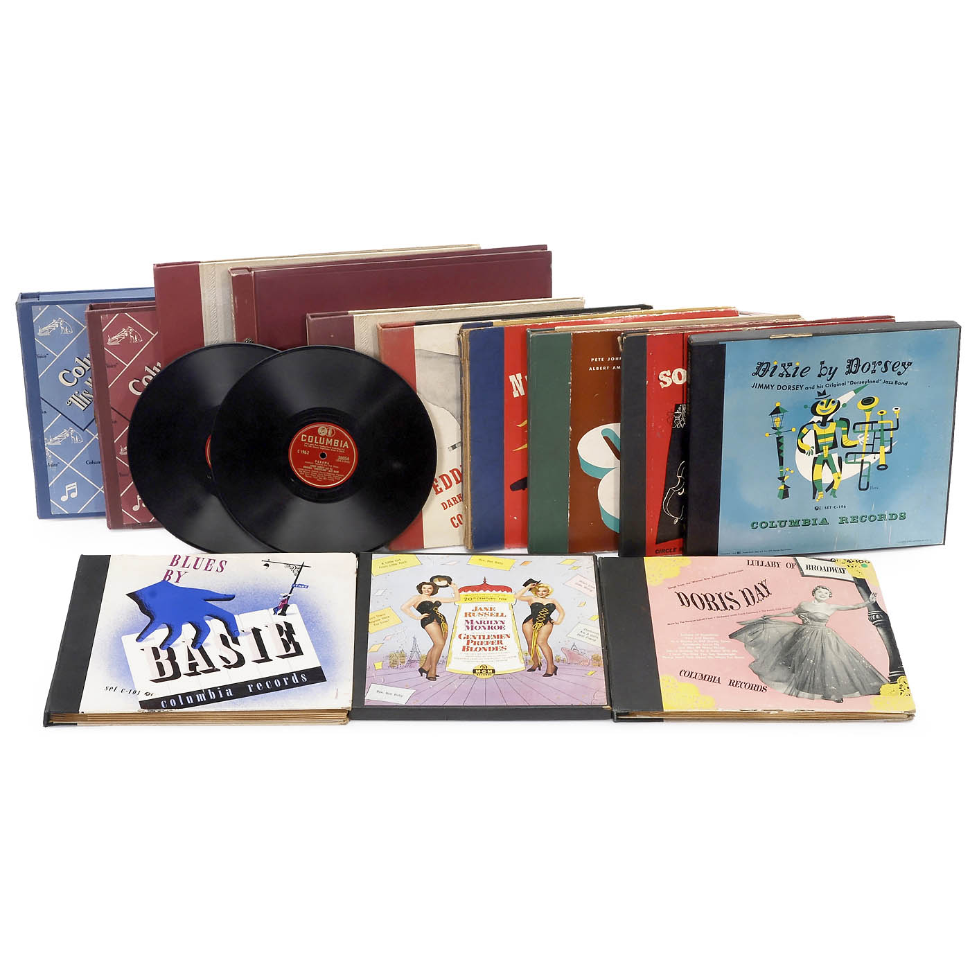 1) MGM, Jane Russell and Marilyn Monroe, 6 titles from the film "Gentlemen Prefer Blondes". – 2) Victor Record, Pete Johnson and Albert Ammons, "To the Bar", 4 records "Boogie Woogie for Dancing". – 3) Circle Records Album S-3, Dan Burley and her Skiffle Boys, "South Side Shake", 3 records. – 4) Columbia Records, Doris Day, "Lullaby of Broadway", 4 records. – 5) Victor Musical Masterpiece, Dorothy Maynor, "Negro Spirituals", 4 records. – 6) Columbia Record Set C-196, Jimmy Dorsey, "Dixie by Dorsey", 4 records. – 7) Victor Musical Masterpiece, Mozart, "Eine kleine Nachtmusik", 2 records. – 8) Electrola, Jack Hylton et son Orchestre, 3 records. – 9) 2 Columbia albums with 10 international records on different labels. – 10) Columbia Records Set C-27, Eddie South, "Dark Angel of the Violin", 4 records. – 11) RCA Victor, Hot Jazz Series Vol. 12, Irving Fazola, "New Orleans Jazz", 4 records. – And: 12) Columbia Records Set C-101, Count Basie, "Blues by Basie", 4 records. – Mixed condition