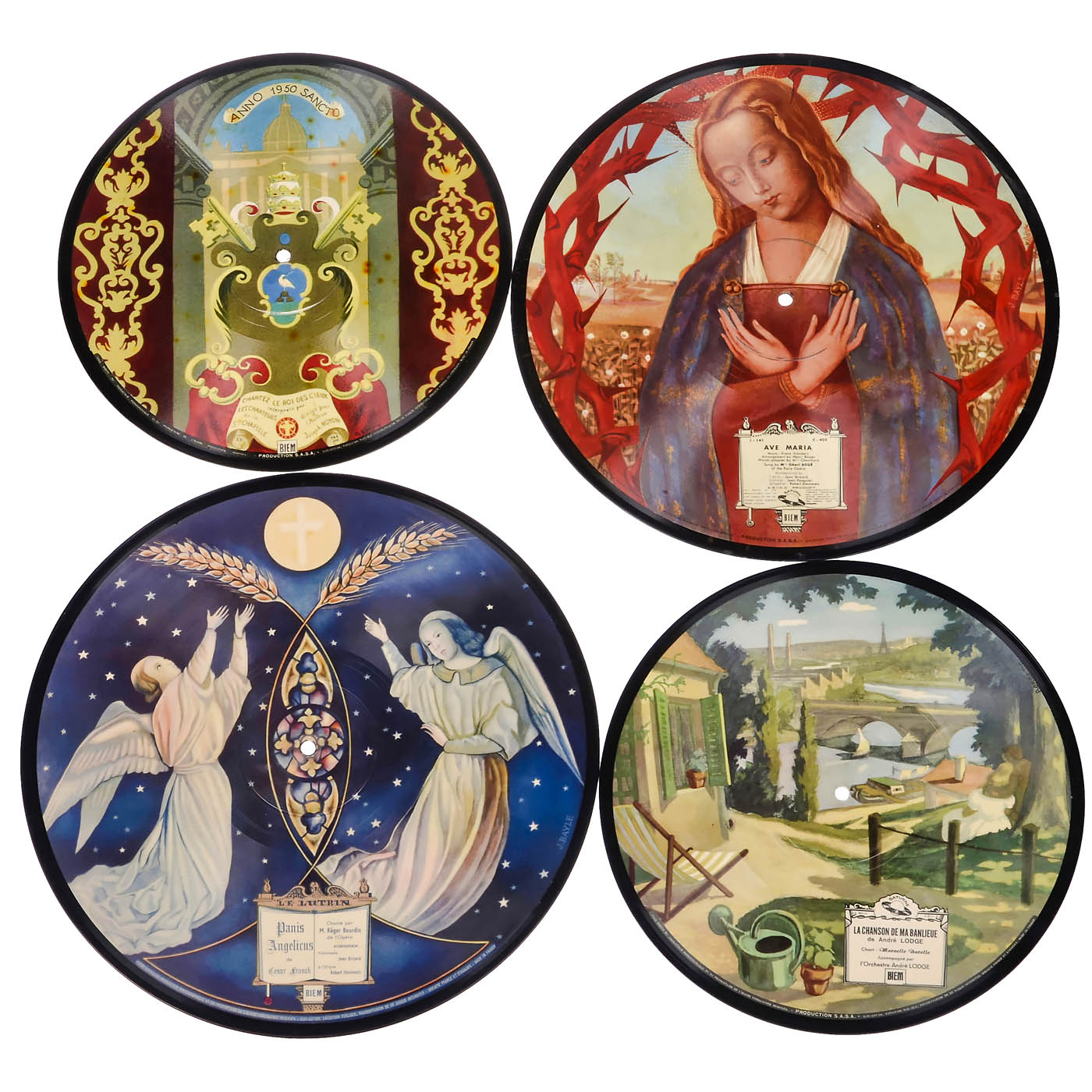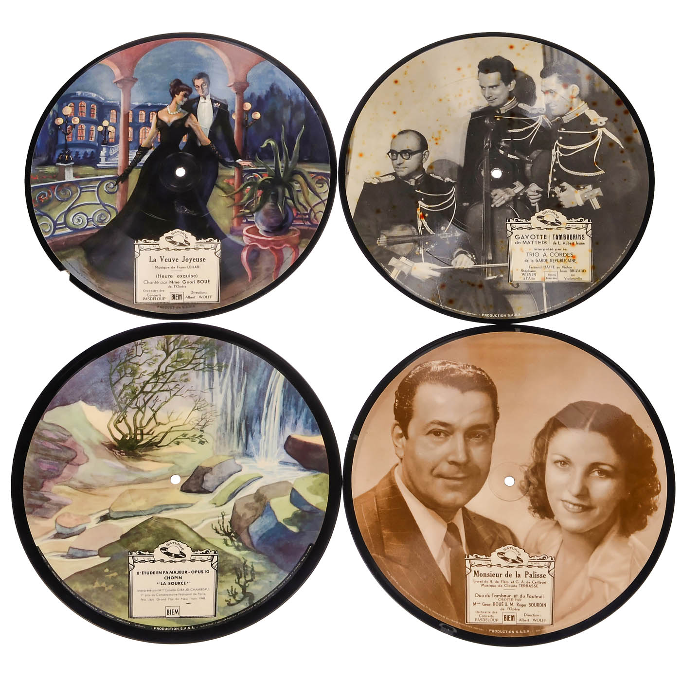 France Production S.A.S.A., 10 and 12 in. records. 1) 2 x D-602, Geori Boué & Roger Bourdin, "Monsieur de la Palisse/La Veuve Joyeuse". – 2) M-513, Colette Giraud-Chambeau, Étude en fa Majeur "La Source"/Étude en ut Mineur "La Révolutionaire". – 3) M-604, Trio à Cordes, "Menuet Italien/Gavotte de Matteis". – 4) J-311, Marcelle Darelle, "La Chanson de ma Banlieule/Les Quais de la Seine". – 5) FAS-100, Pope Pius XII, "Chanteurs de la Ste Chapelle/Chantez le Roi des cieux". – And: 6) 2 x AV-2, Le Lutrin, "Panis Angelicus/Ave Maria". – Mixed condition.