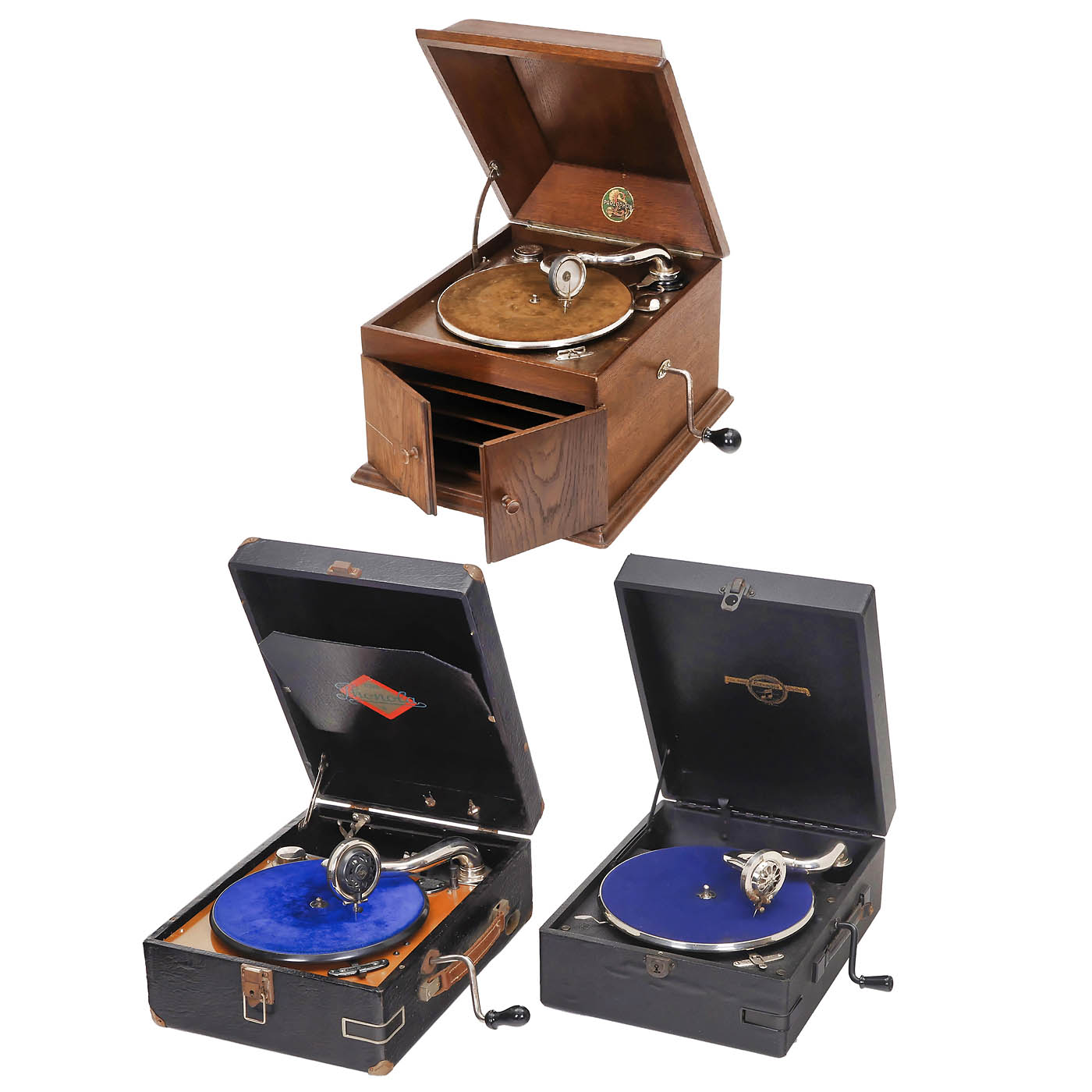 1) Osro-Phonola, model 111, portable, Osro repro-ducer, spring and electric motor drive, with mains cable. – 2) Parlophon, model Parlonette, Carl Lindström, Berlin, table model, oak case. – And: 3) Columbia, portable, HMV No. 21 reproducer. – All working.