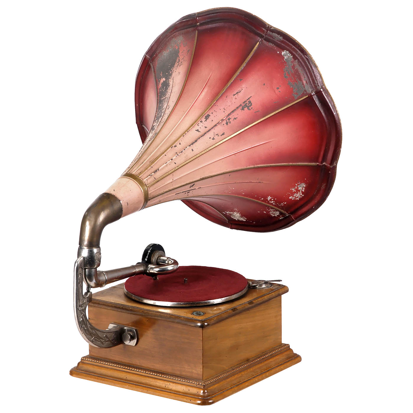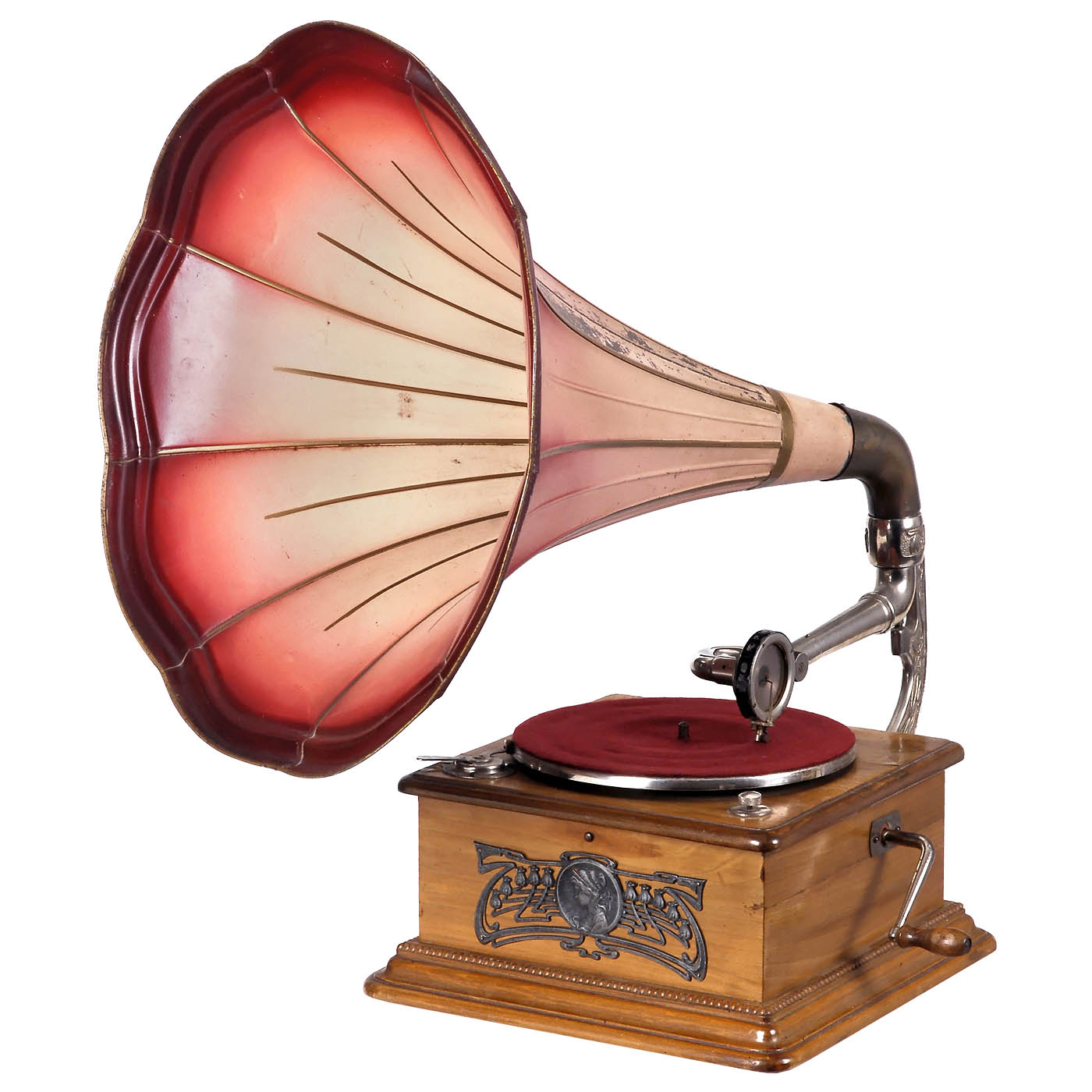 Front with embossed metal plaque, pale wood cabinet, 10-inch turntable, Parlophon mica soundbox, original lacquered metal horn, Ø 19 1/3 in., very good working condition.