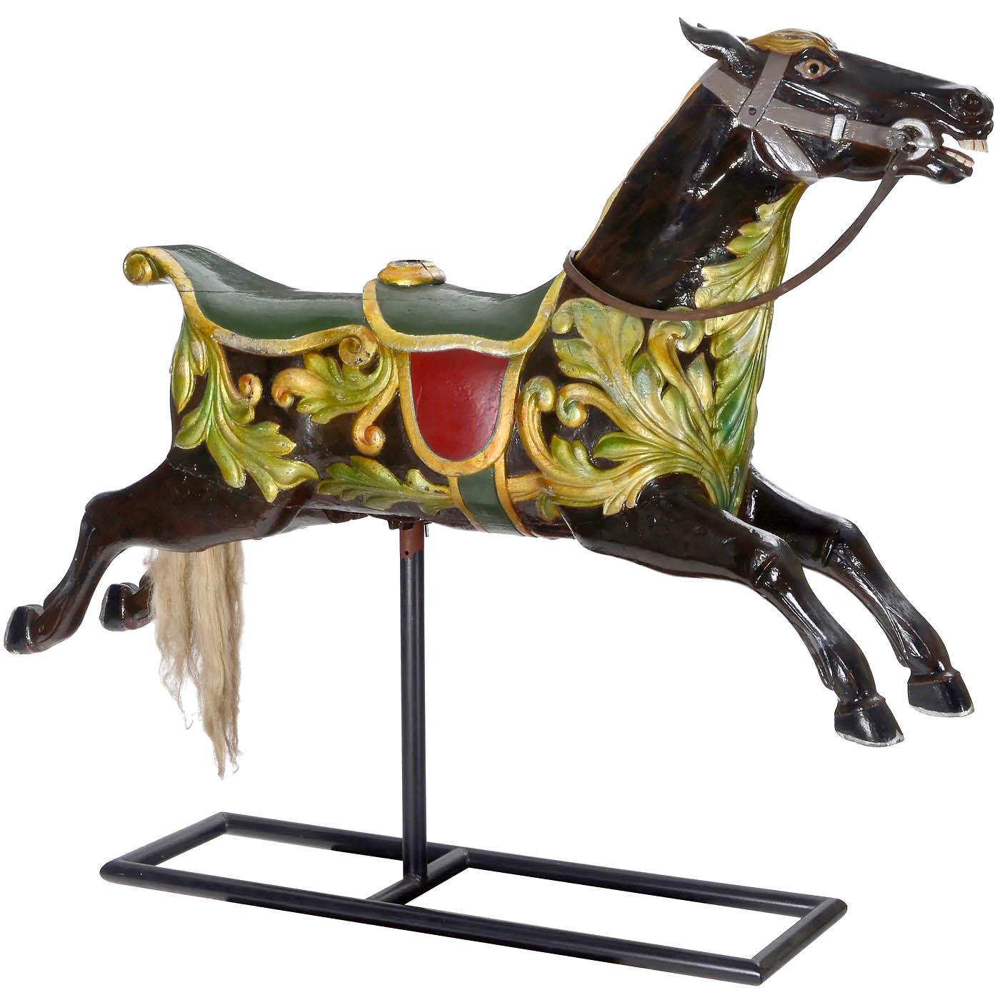 Large double-seater, by Arthur E. Anderson, Designer & Wood Carver, Bristol, elaborately carved figure with inset glass eyes, real horse hair tail, an oversized scarlet Lychnis flower on its bridle and a typically large buckle-strap around its girth, the horse’s body decorated with dense carved foliage like a row of giant seeds, overpainted in the style of the maker, height 46 in., length 71 in. – Note: The long stretched-out body, the flattened ears and the swirled acanthus leaves serve to create a dynamic impression. In combination with the artistically eccentric style of the wood sculptor, this horse is one of the most impressive works of fairground art.