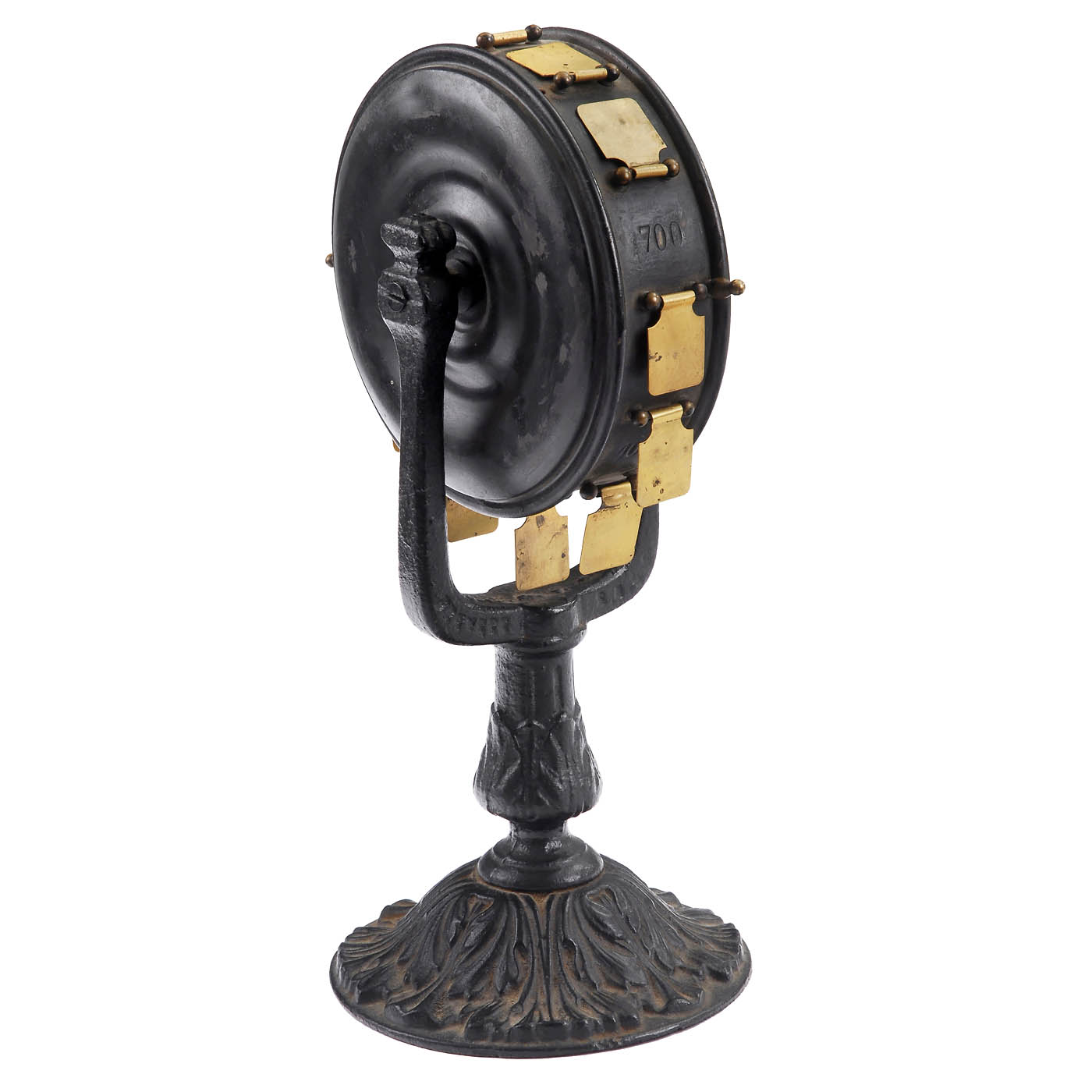 Hand-turned embossed tin drum with 12 winning fields covered with a brass plate, point values from 10 to 8000, Ø 5, on heavy cast-iron base, overall height 11 in., working.