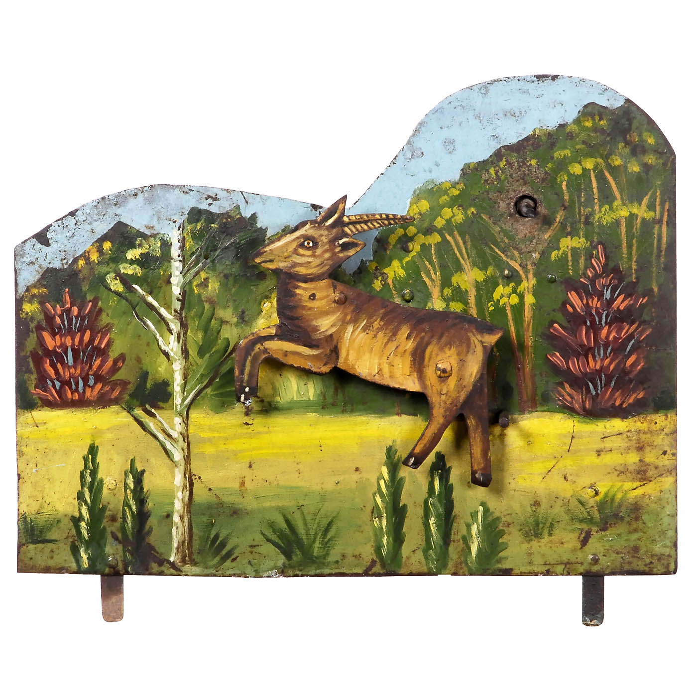 Weight-operated mechanical targets, 1) "Lion". 2) "Monkey" and "Gazelle", hand-painted sheet metal, size 19 ½ x 15 ½ in. Sheet metal and paint well preserved except for shot marks, missing springs and one target. – Note: Mechanical shooting gallery figures were a popular fairground attraction from the 1870s–1920s. They were mostly made by gunsmiths who also supplied the rifles for the shooting stands. The shooter had to aim at the small round target, which triggered the weight-driven animated scene when hit. Behind the targets, a showman's assistant was kept busy returning the mechanism to its original position. – Rare to find. Fairground nostalgia of museum quality!