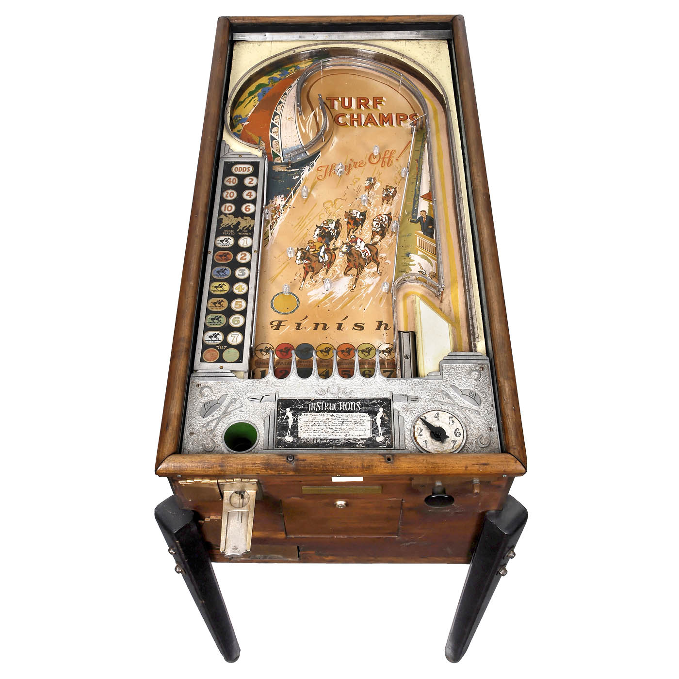 Stoner Manufacturing Company of Aurora, Illinois, USA. Design by Karl Knickerbocker, electromechanical, 110 volts, Turf Champs was advertised as a "one shot – 5 balls" game. Five balls are shot simultaneously so as to simulate a horse race. Up to 7 selections could be made prior to shooting the balls into play. Each selection cost 5 cents, therefore one play could cost up to 35 cents. Odds were randomly selected by the machine. Wood case with legs, size 23 x 45 in. Good and complete original condition, untested, no key. Very rare in Europe, a hard to find early arcade game.