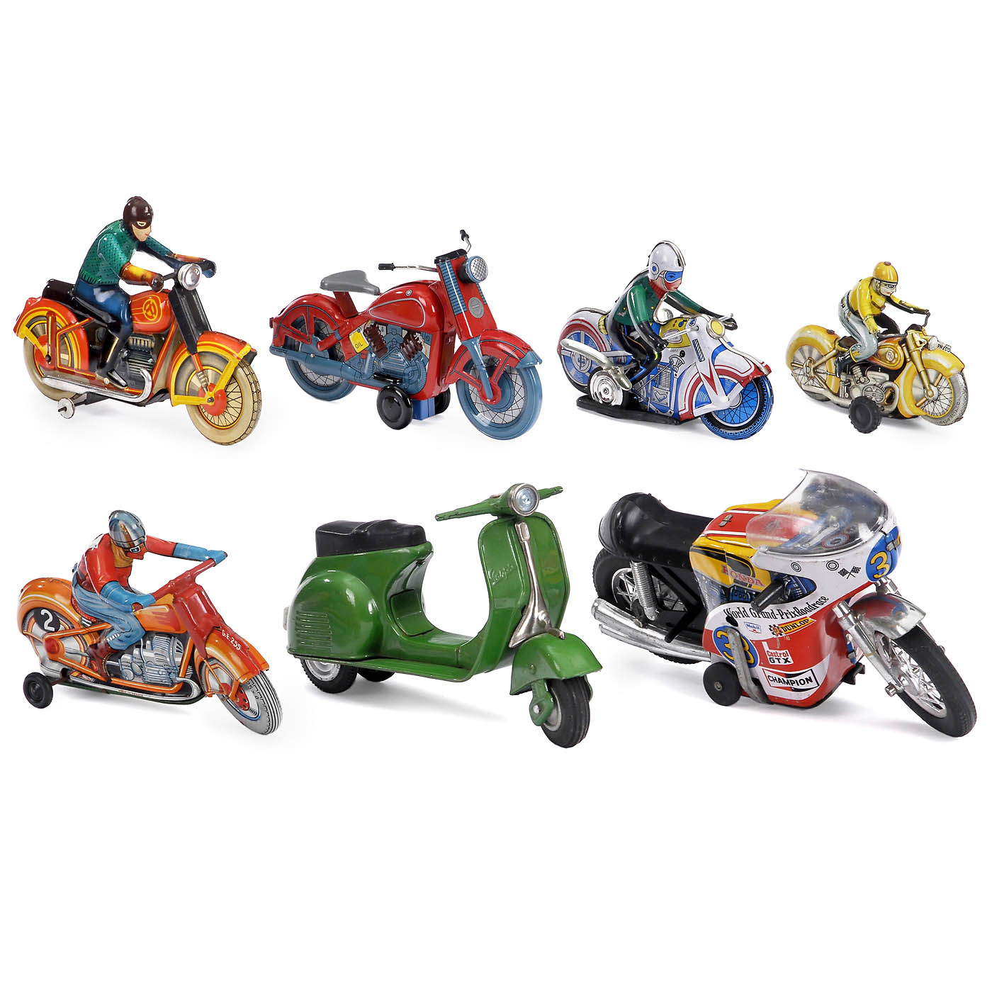 Lithographed tin. 1) PN200, c. 1955, Philipp Niedermeier, Nuremberg. The rider performs a handstand. Spring defective, length 6 ¼ in. – 2) MS-359, China, c. 1995, spring drive working, length 8 ½ in. – 3) MS-702, China, c. 1990, spring drive working, length 7 in. – 4) Unmarked, spring drive working, length 8 ¾ in. – 5) GE 255, Technofix, c. 1970, Made in France, spring drive working, length 7 in. – 6) Grand Prix motorbike, c. 1985, TPS, Japan, battery-operated (untested), length 10 ¼ in. – And: 7) Vespa, c. 1960, Bandai, Japan, friction-driven, length 8 ¾ in.