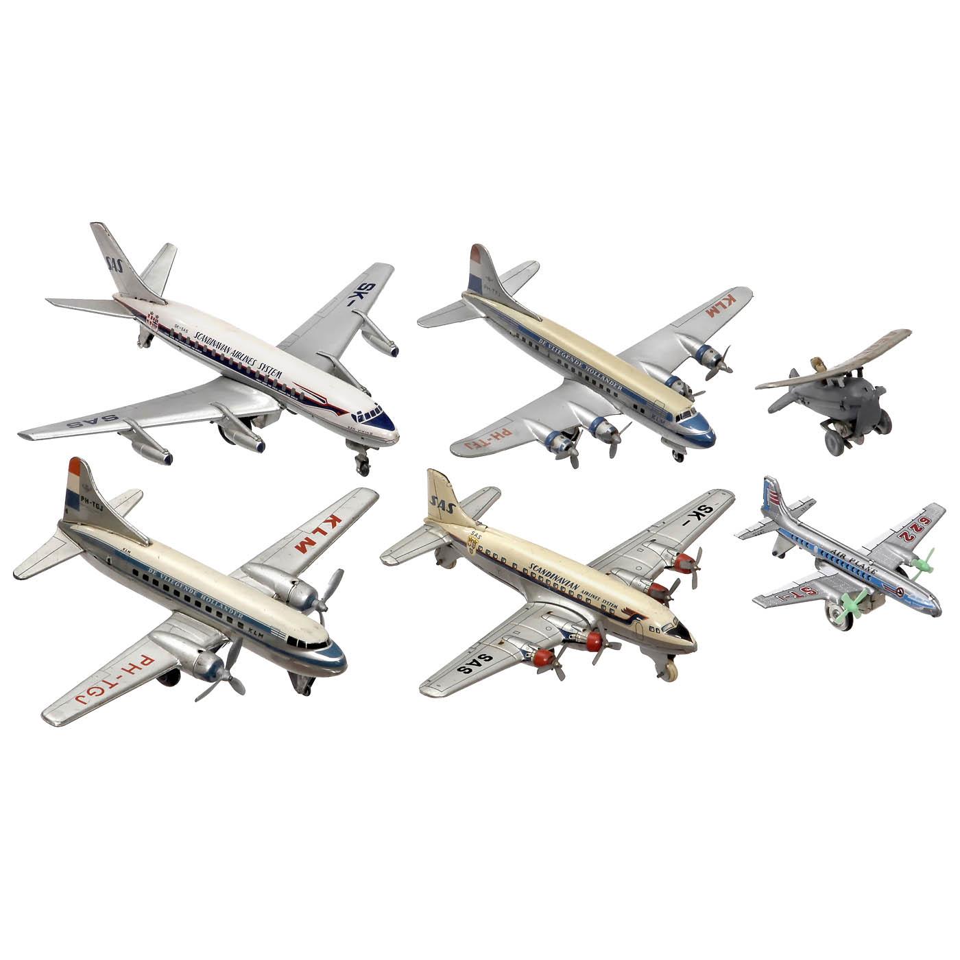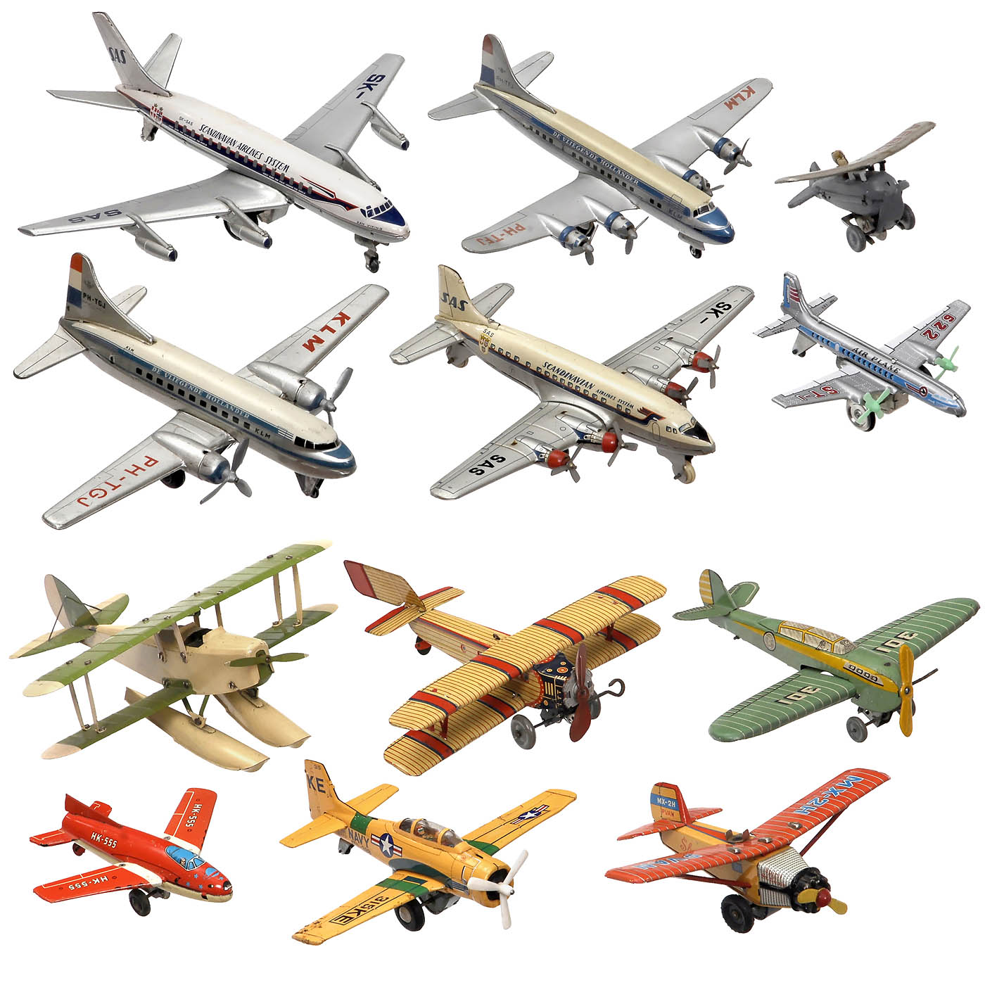 1) Arnold, Germany. Douglas DC 6B, The Flying Dutchman (De Vliegende Hollander), lithographed tin, friction drive (working), length 10 in. – 2) Yonezawa, Japan. Scandinavian Airlines System, lithographed tin, friction drive (working), length 9 ½ in. – 3) Hammerer & Kühlwein, Germany. HK-555, lithographed tin, friction drive (working), length 6 ¼ in. – 4) Wells, England. No. 301, lithographed tin, friction drive (working), length 8 ¾ in. – 5) Unmarked, probably Wells, England. Lithographed tin, spring drive (working), length 9 ½ in. – 6) Marusan, Japan. Viking, Scandinavian Airlines System, lithographed tin, friction drive (working), 1 wheel missing, length 12 ½ in. – 7) Meccano, England. Biplane seaplane, painted tin, length 10 in. – 8) Bandai, Japan. MX-2H, Sky Bird, lithographed tin, friction drive (working), length 6 ¾ in. – 9) Bandai, Japan. 315-KE, Navy, lithographed tin, friction drive (working), length 6 ¾ in. – 10) Tippco, Germany. Convair KLM PH-TGJ, The Flying Dutchman (De Vliegende Hollander), lithographed tin, friction drive (working), length 10 in. – And: 11) 2 more models.
