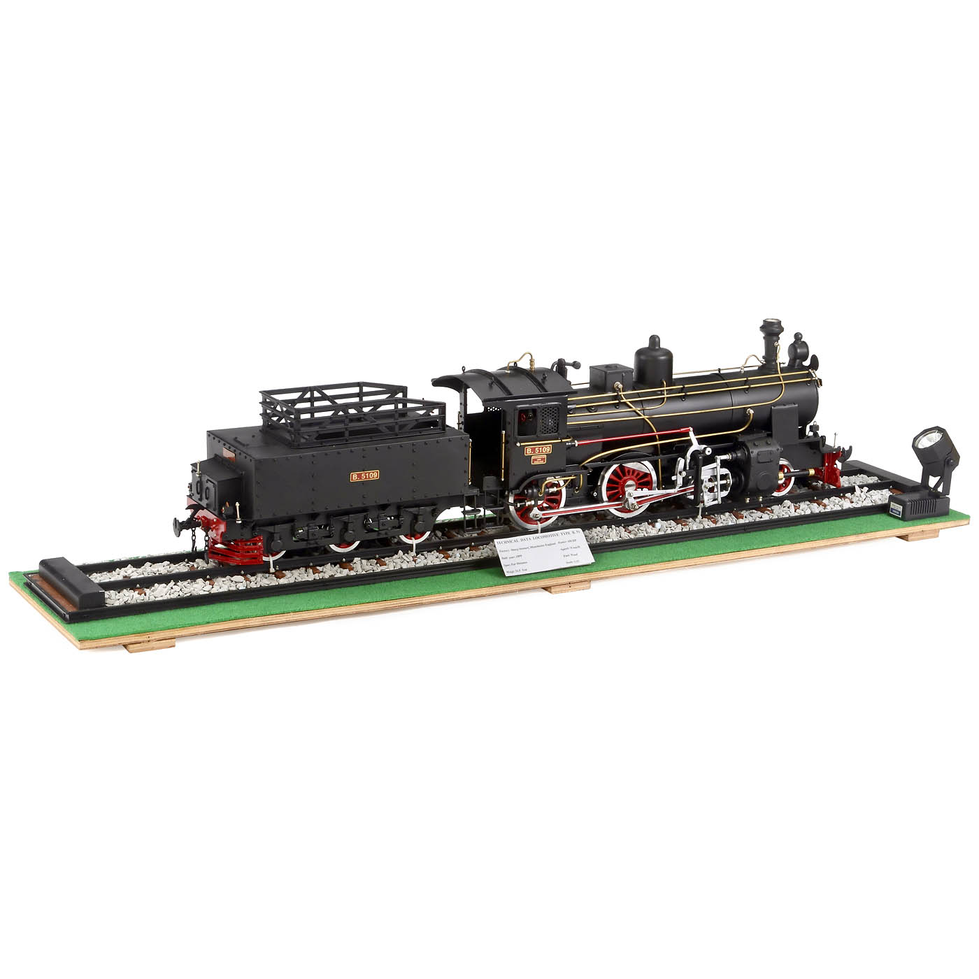 1:16 detailed scale model of the Indonesian steam locomotive, sheet metal, brass and steel, 89 mm gauge, wheel arrangement 4-4-0, Walschaerts valve gear, with cowcatcher, lg. 47 in., on rails under glass cover, with lighting. – Note: The original of this model was manufactured 1899 by Sharp Stewart in Manchester and delivered to Indonesia.