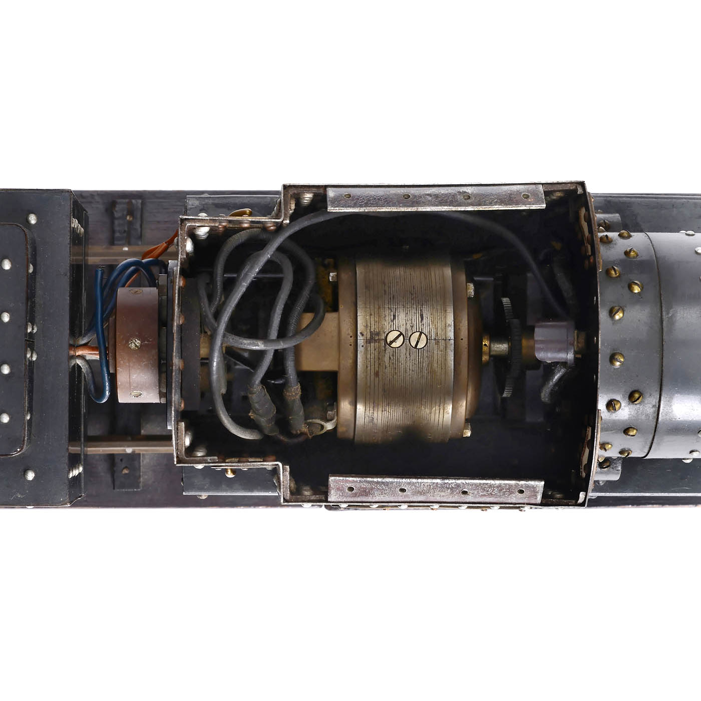 1:20,3 scale, 70,64 mm standard gauge, National Model Railroad Association, Inc. (NMRA) norm, fast train locomotive, 4-6-4 wheel arrangement, electric motor drive (untested), roller pantograph for rails with center conductor, cardan shaft power transmission to the driving wheels, detailed Heusinger control, cast-metal spoked wheels, heavy metal frame, riveted metal sheet boiler, covering and tender, spring-loaded coupling, total length 37 in., on 2 rails.