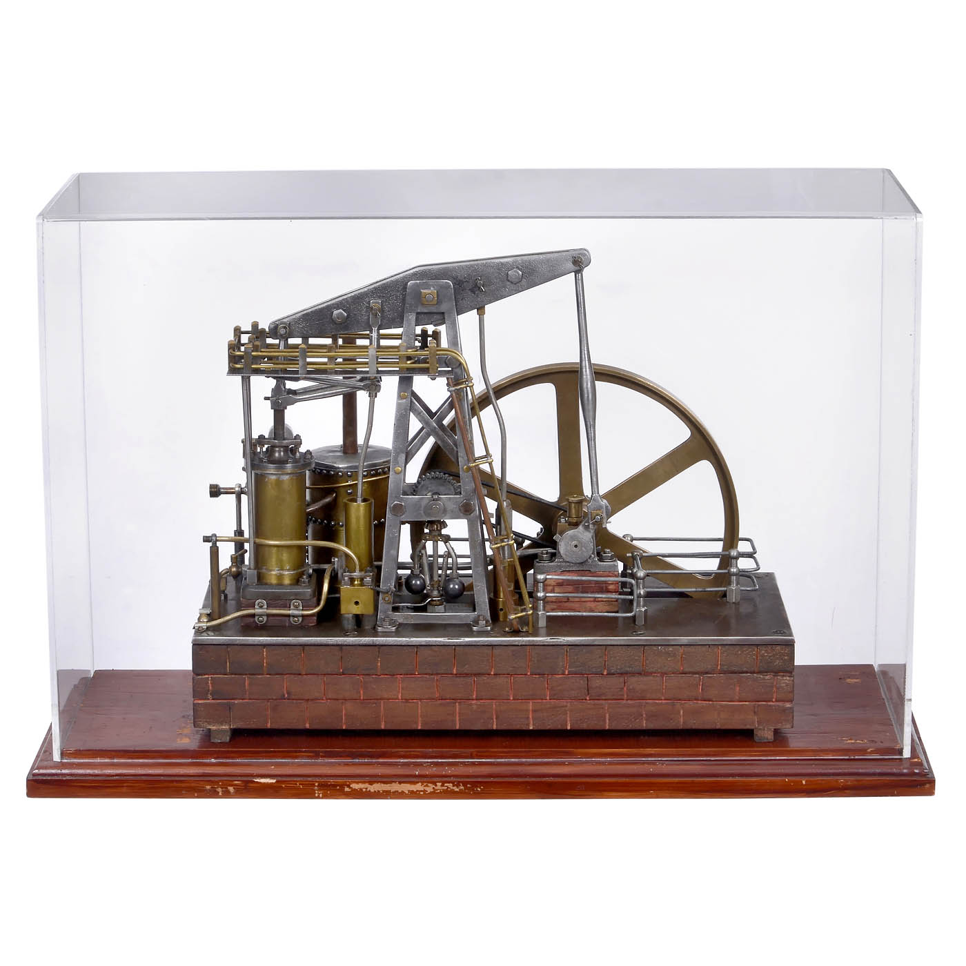 Large precision model with working governor, feed pump, oilers, belt-drive. Flywheel Ø 11 in., overall size 23 x 10 1/5 x 18 1/4 in., working condition. With Perspex display case.