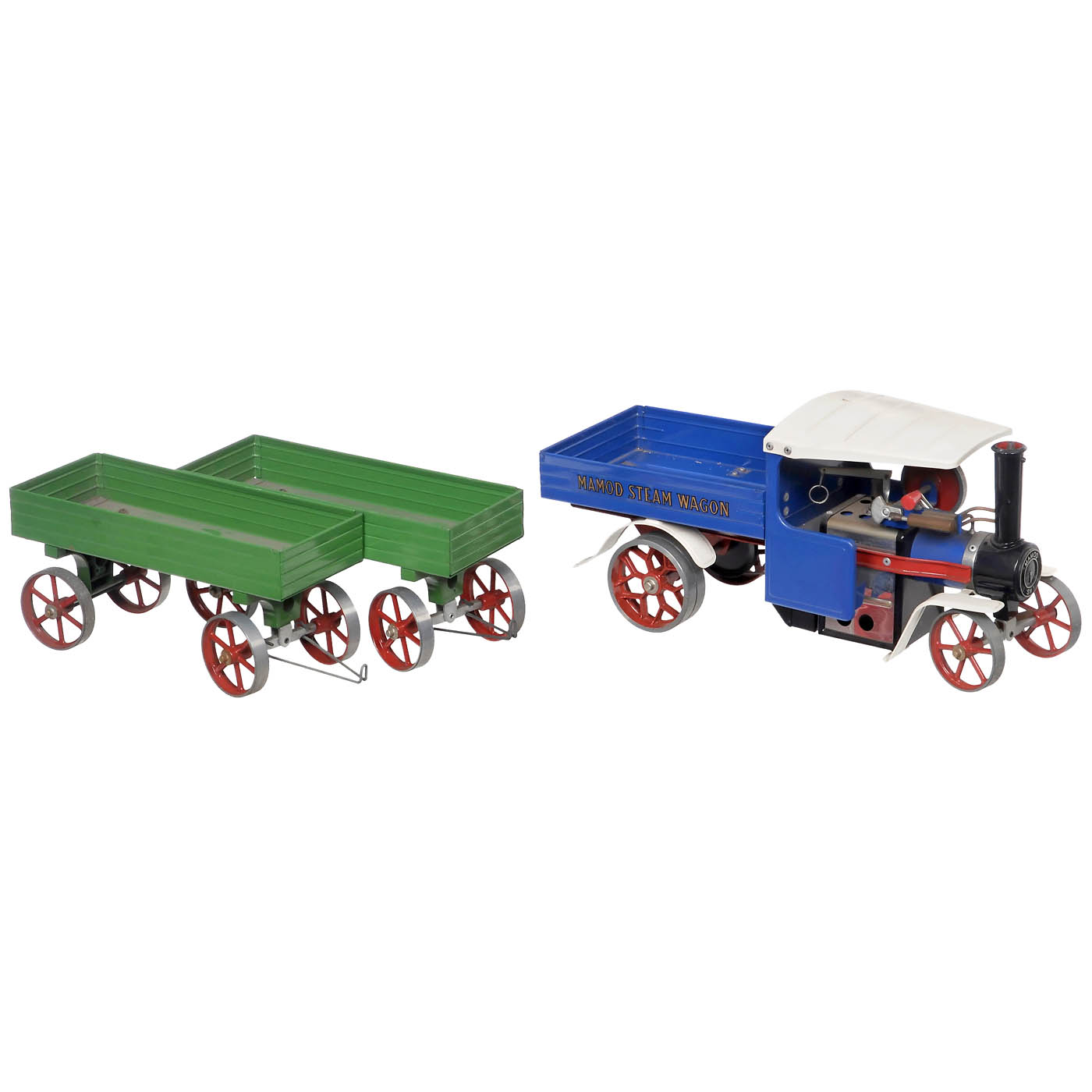 1) Showman's Engine, Wilesco model D 409, chain-steered front axle, dynamo for lighting, length 11 ¾ in. – 2) Steam truck, Mamod model SW1, length 16 in. – 3) Steam road roller, Wilesco "Old Smoky", chain-steered front axle, slightly rusty, length 12 ½ in. – 4) 2 Mamod trailers, cast-metal wheels, length 10 in. each. – And: 5) Wilesco steam toys: rocket carousel, Ferris wheel, circus elephant, aeroplane carousel, barrel organ grinder and swing boat – In addition: Model of an English horse carousel, paper and plastic, and climbing monkey "Curt", Düsseldorf Blech-Spielwaren.