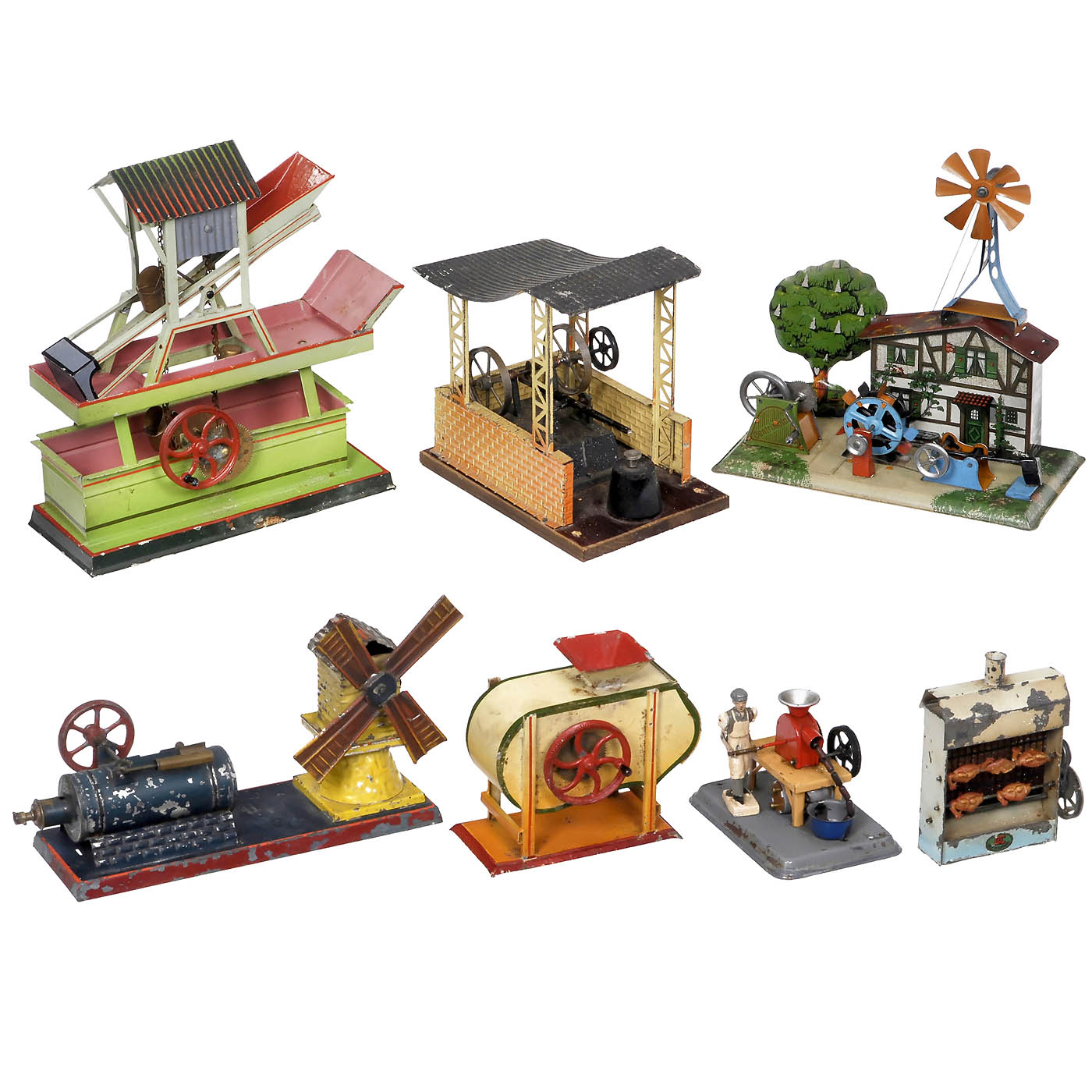 1) Doll, tipper excavator no. 717/1, hand-painted, height 10 5/8 in., working. (3+/2) – 2) Doll, chicken rotisserie no. 916, with 5 chickens on spit, base loose, working. (3–4/2–3) – 3) Doll, grain cleaning mill no. 671, hand-painted, height 4 4/5 in., working. (2/2) – 4) Doll, automatic hammer no. 646/0, hand-painted, hammer missing, wood base, height 6 ¾ in. (3/4) – 5) Doll, compressed-air motor with windmill, hand-painted, width 9 7/8 in. (3–4/4) – 6) Fleischmann, sausage machine no. 236, painted tin, working. (3/3) – And: 7) Wilhelm Kraus, wind and water mill, with Centrimotor, lithographed tin, width 9 ¼ in., working. (2-/2)