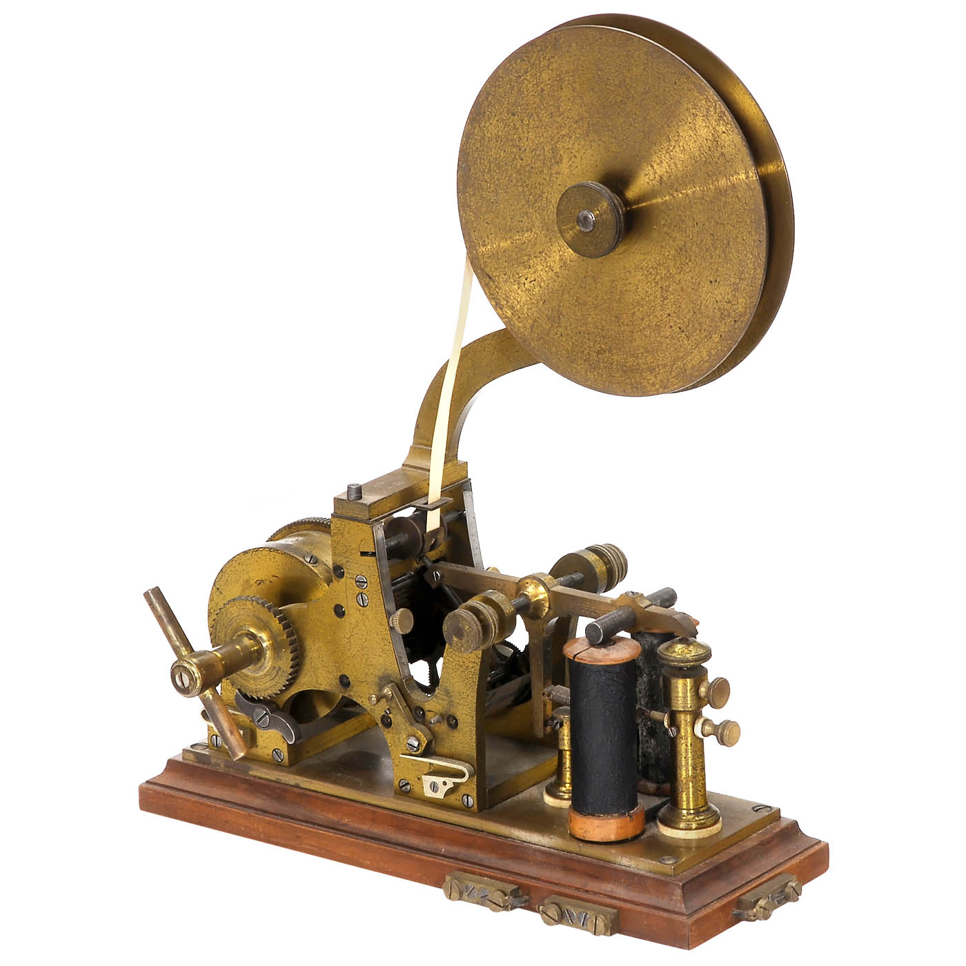 Early telegraph, marked "J.M. Ekling", "Karl Ekling", and "K.K.T.W. No. 1166", "No.422" and "No.752", original lacquered brass, on walnut base, 11 3/4 x 4 1/3 in., clockwork motor (working). – Very rare and early collector's item and exhibition piece!