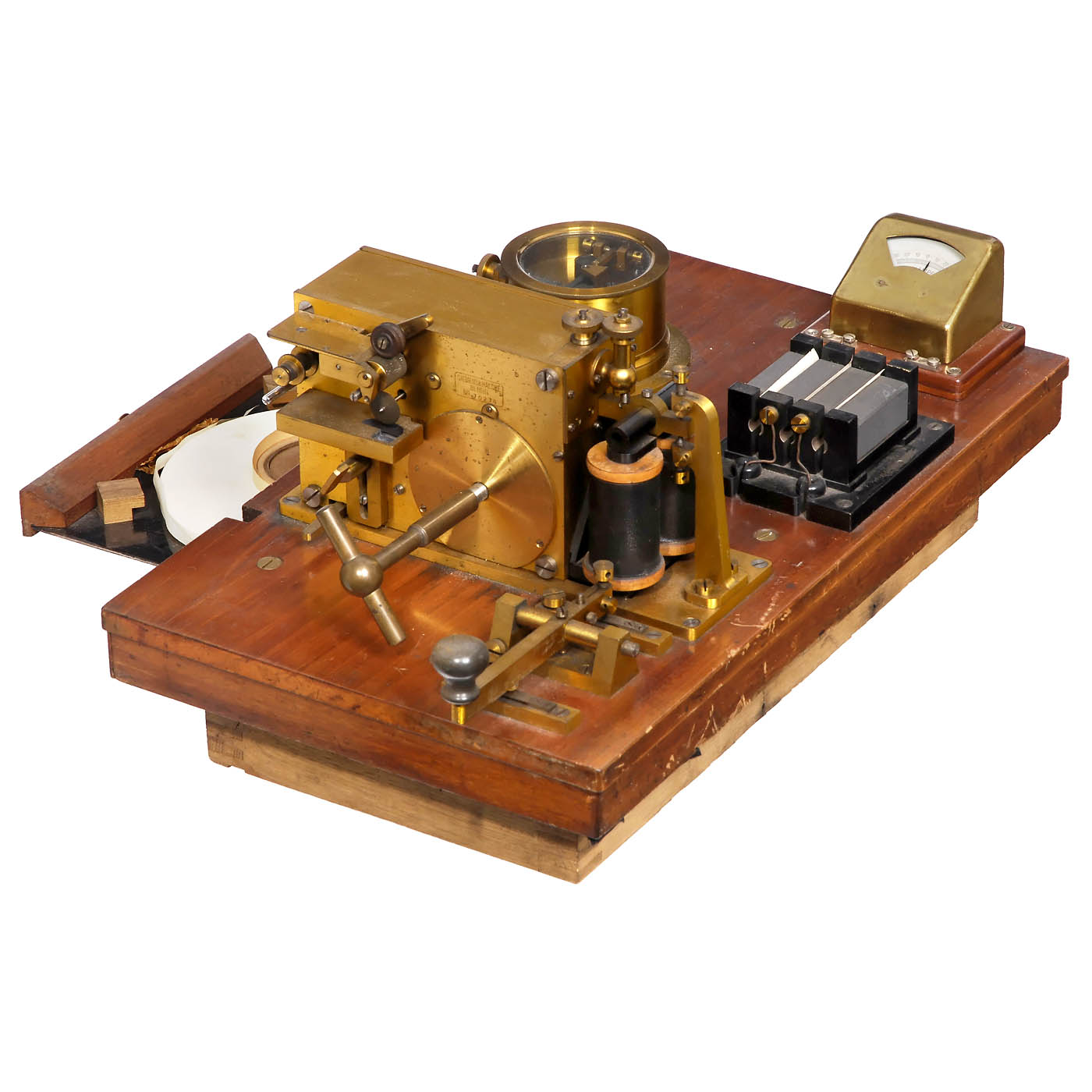 Ink writer no. 70276, spring-driven (working), original lacquered brass, with relay, galvanometer, lightning protection and Morse key, drawer with paper strip.
