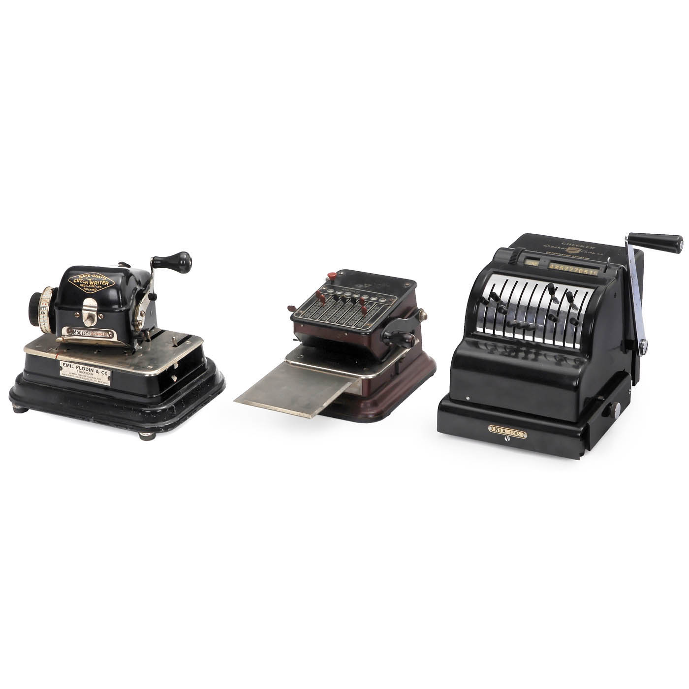 1) "The Protectograph Check Writer", c. 1920, G.W. Todd & Co., Rochester, NY. - 2) Cummins' Initial Machine, The B.F. Cummins Co., Chicago, IL, not a real check writer, for perforating owners' initials in leather hat bands and fabric. - 3) Checker, c. 1930, Checker Company Copenhagen, plastic case, one edge broken. - 4) Todd Protectograph, c. 1925, lever-operated. - 5) Unmarked, probably Mattson Check Perforator, Thus Anders Mattson's Engineering Works at Mora, Sweden, cast-iron, mechanism sticks. - 6) Gains Reminder Clock, The Alden Spear's Company, with clock that sounds an alarm at the expiration of a predetermined time interval. - And: 7) Safe-Guard Check Writer, Model Y, 1917, New York, export model for Sweden.