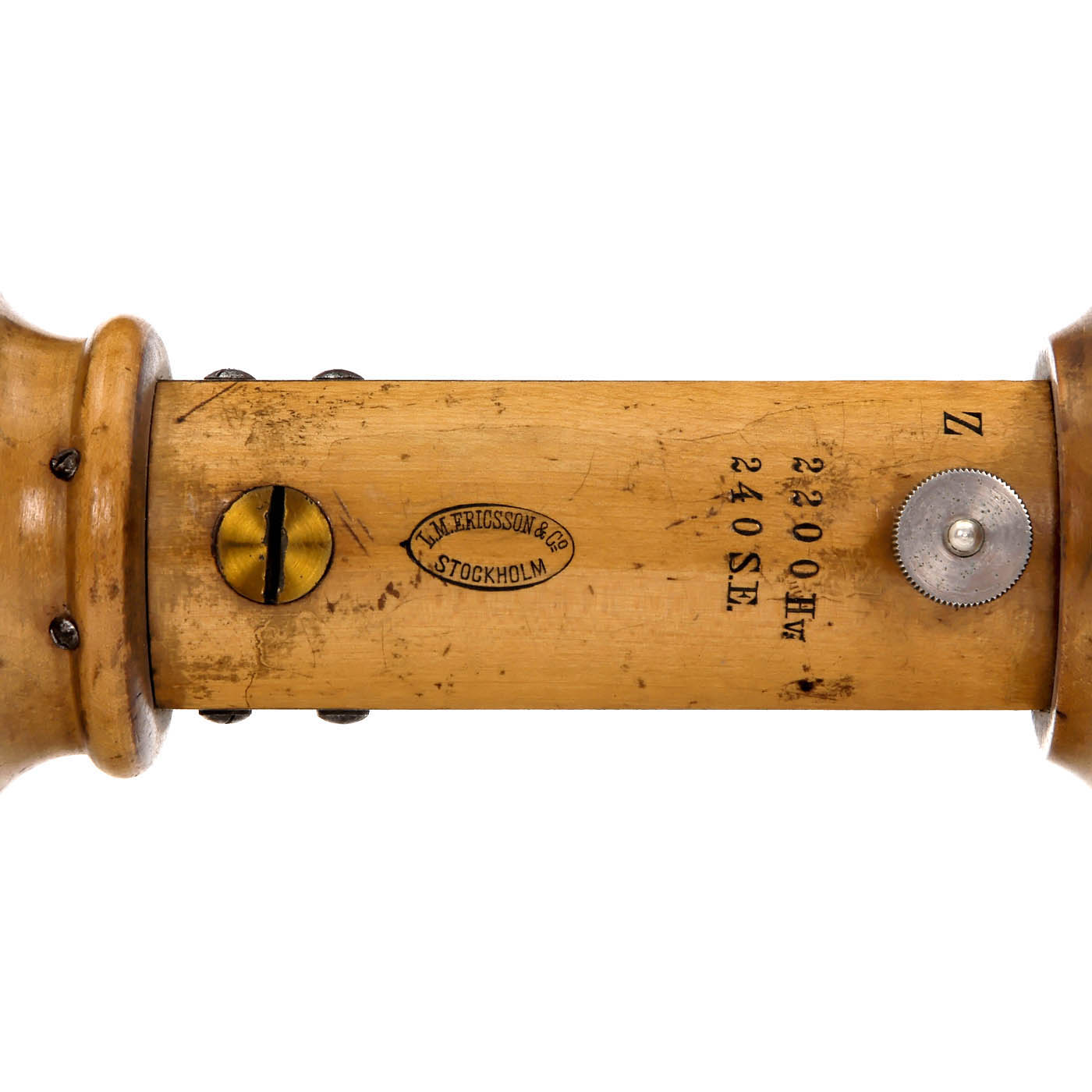 Turned wood and nickel-plated metal parts, stamped with: "2200H.v. - 240S.E. - L.M. Ericsson & Co, Stockholm", printed instructions at the base, bakelite trumpet, height 7 ¼ in. - Note: This model is more or less a copy of the Siemens telephone, with the addition of some improvements carried out by Ericsson. Ericsson began repairing telephones, telegraphs and scientific instruments in his workshop, leading to the construction of his own telephone in 1878. - Literature: For an early description of magnetic telephones and their development, see Preece and Maier (1889), "The Telephone". For a comparison between Ericsson and Siemens & Halske receivers, see Povey and Earl (1988), "Vintage Telephones of the World", fig. 1.7 and 1.8; Ken Bushell, article: http://telephonecollecting.org/receiver.html.