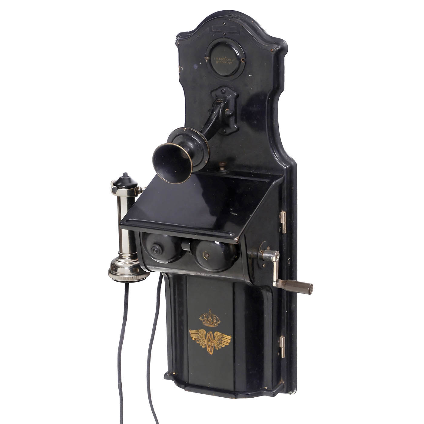 Model AB 2120, black-lacquered metal case with transfer of crown and winged wheel, five-part crank inductor, height-adjustable microphone, Bell-type earphone, double bell.
