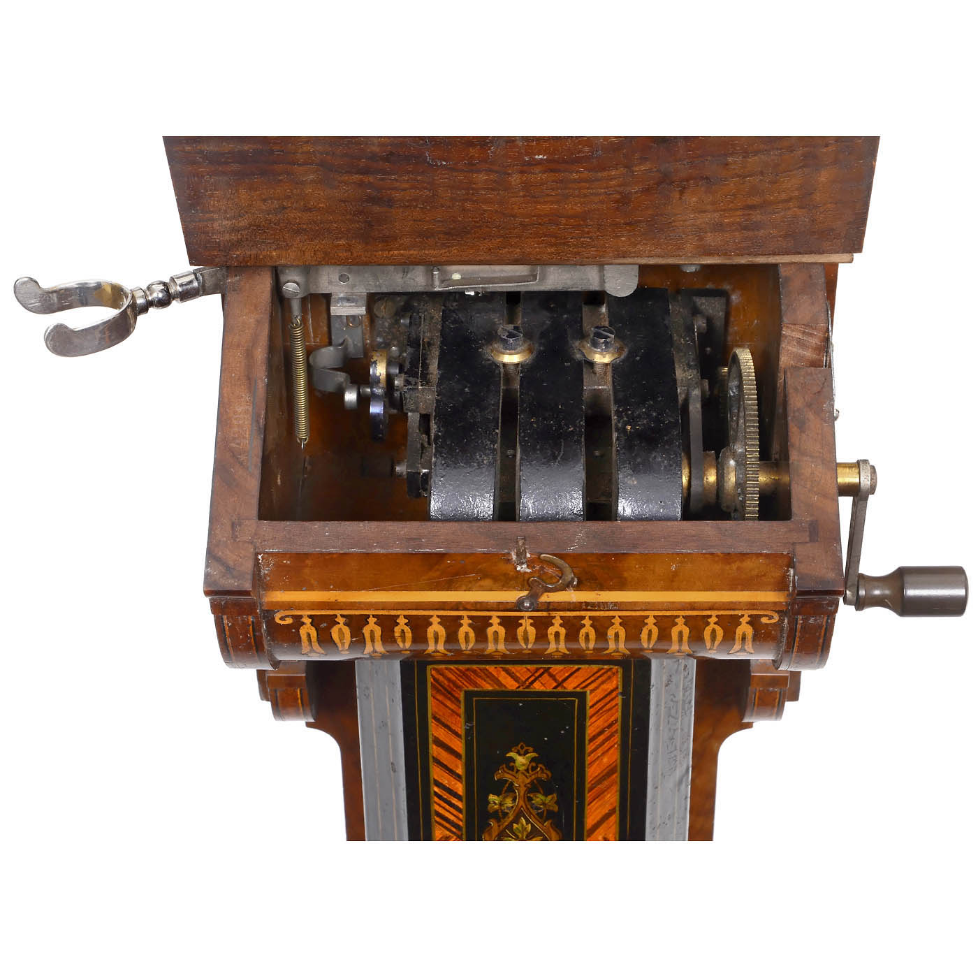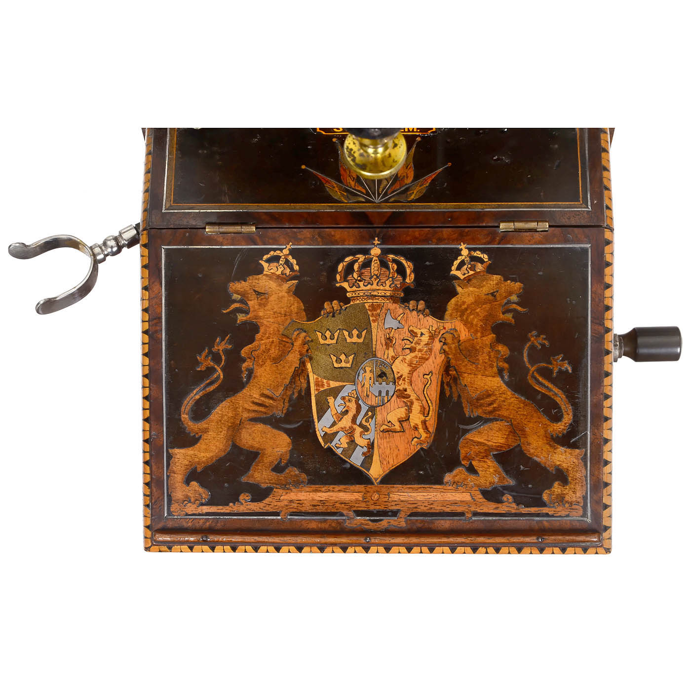L.M. Ericsson, Stockholm, Sweden. Walnut case, marquetry-inlaid writing desk with large Swedish-Nor-wegian coat of arms, fishtail-shaped tin battery cover, original decal, early and rare helical microphone with screw for simple and accurate regulation of the contact pressure, 3-part crank inductor, double bell, lightning protection, Bell-type earphone, very good original condition. One of a kind!