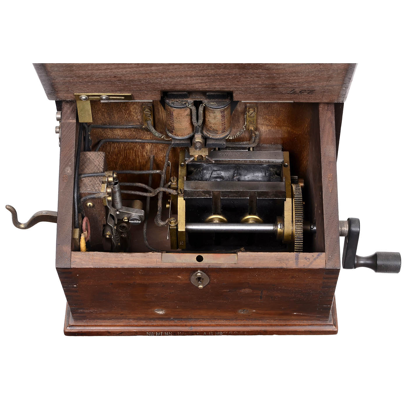 Berlin, walnut case, no. 75355, embossed with crown and the dates 12.4.00 and 25.6.07, carbon microphone by Mix & Genest, 3-part crank inductor, spoon-shaped earphone, double bell, writing desk, with lock and key.