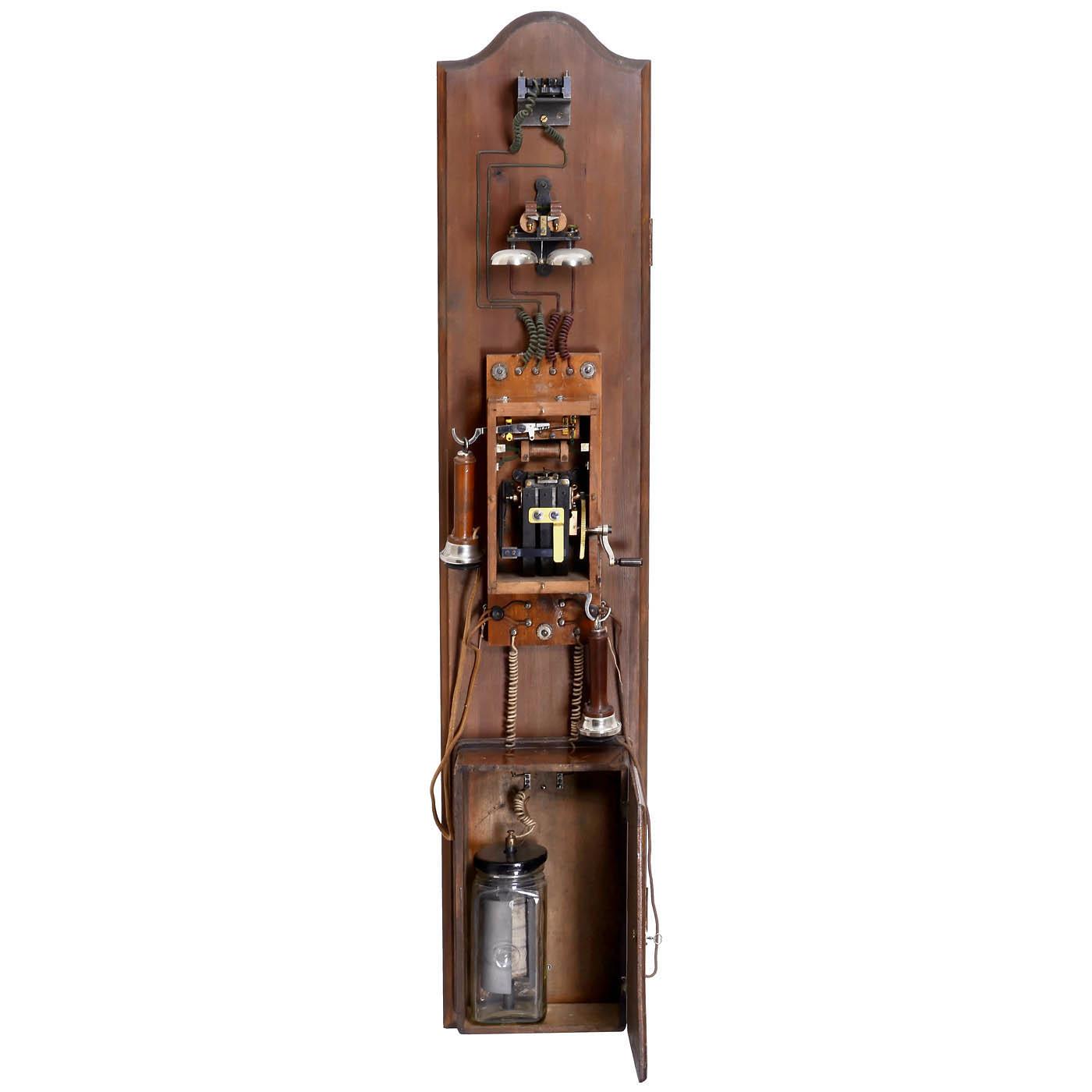 Friedrich Reiner, Munich. No. 14641, standard model of the "Generaldirektion der Königlich Bayerischen Posten und Telegraphen", polished walnut cases, consisting of: carbon-pencil microphone with wood membrane and porcelain mount, main case with three-part crank inductor and switch, 2 Bell-type earphones, double bell, lightning protector and battery case with chromic-acid cell, overall height 59 in.