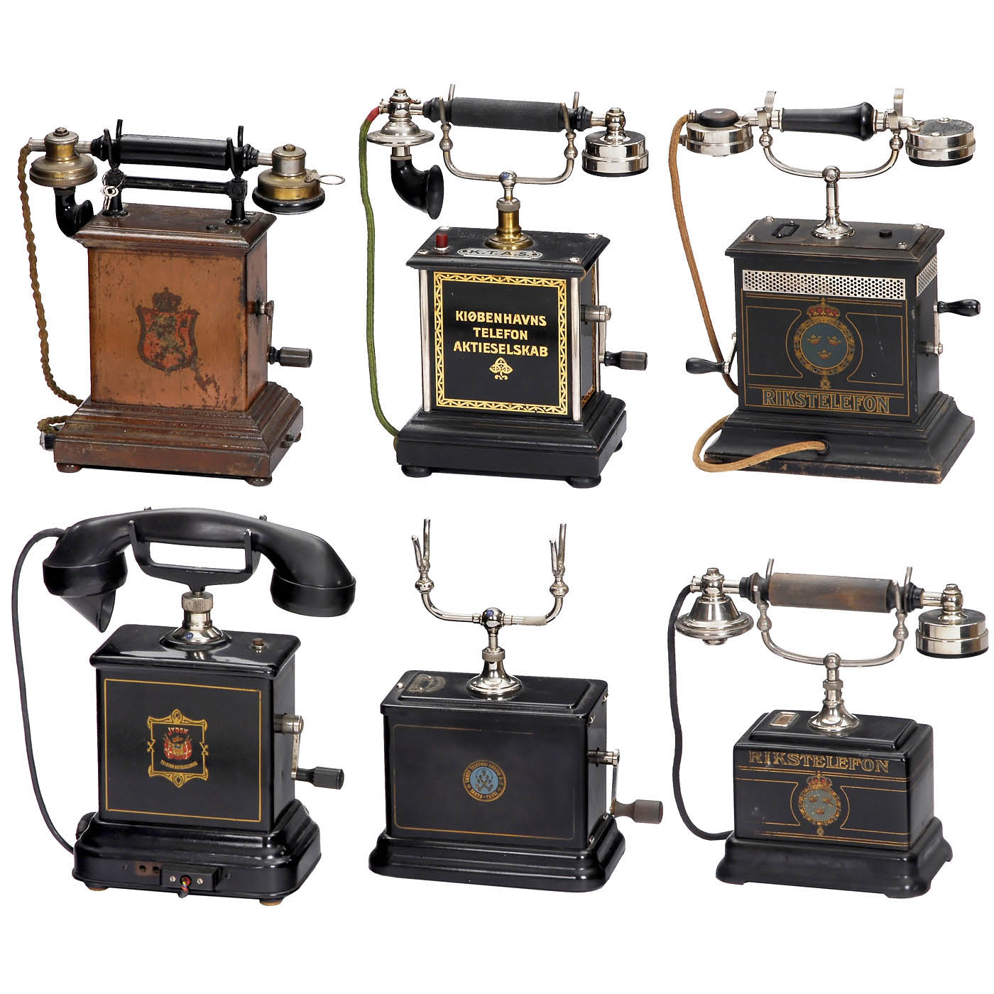 1) Rikstelefon Model AB 112, c. 1905, made by Kungliga Telegrafverkets Verkstad, Stockholm, metal case, decorated with crown and "Rikstelefon", inductor coil with two cranks, handset with speaking horn. - 2) Model AC 300, 1902 onwards, L.M. Ericsson, Stockholm, decorated tin case with label "Kjobenhavns Telefon Aktieselskab", wood base, double bell, magnet generator, handset with speaking horn. - 3) Norwegian model, Elektrisk Aktieselskabet Kristiania, metal case with coat of arms, wood base, handset with speaking horn. - 4) Model 306b, c. 1912, Tartu Telefoni Wabrik, Estonia, metal case, without handset. - 5) Model N 1300, c. 1910, L.M. Ericsson, Stockholm, metal case, handset missing speaking horn. - And: 6) Danish model, c. 1920, Jydsk Telefon Aktielskab, metal case, bakelite handset.