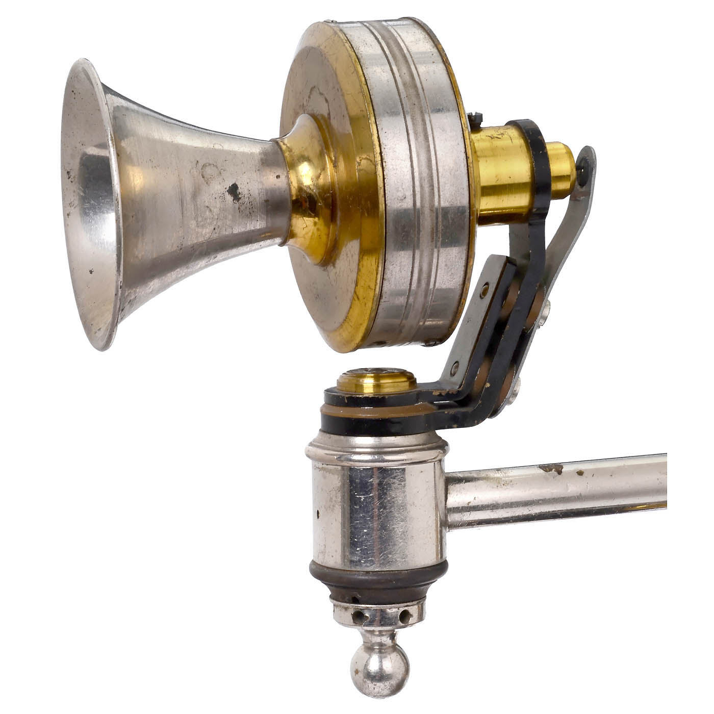 Transfer-decorated base marked: "L.M. Ericsson & Co., Stockholm", swiveling microphone support, carbon-granule transmitter, Bell-type earphone, double-bell, lightning protection, handcrank. Very good original condition.