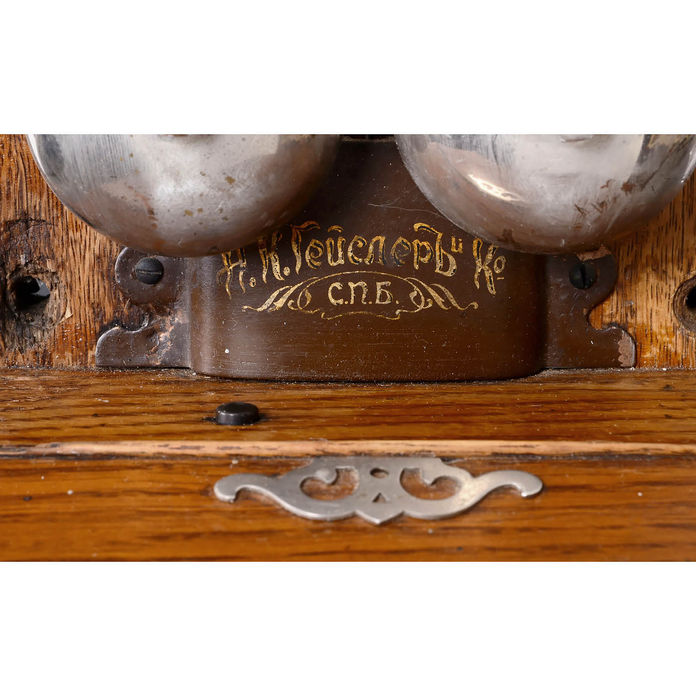 L.M. Ericsson, St. Petersburg, Russia. Oak case with tin battery cover, attractive Cyrillic transfer, writing slope, handset with speaking horn, 3-part crank inductor, double bell, very good original condition.