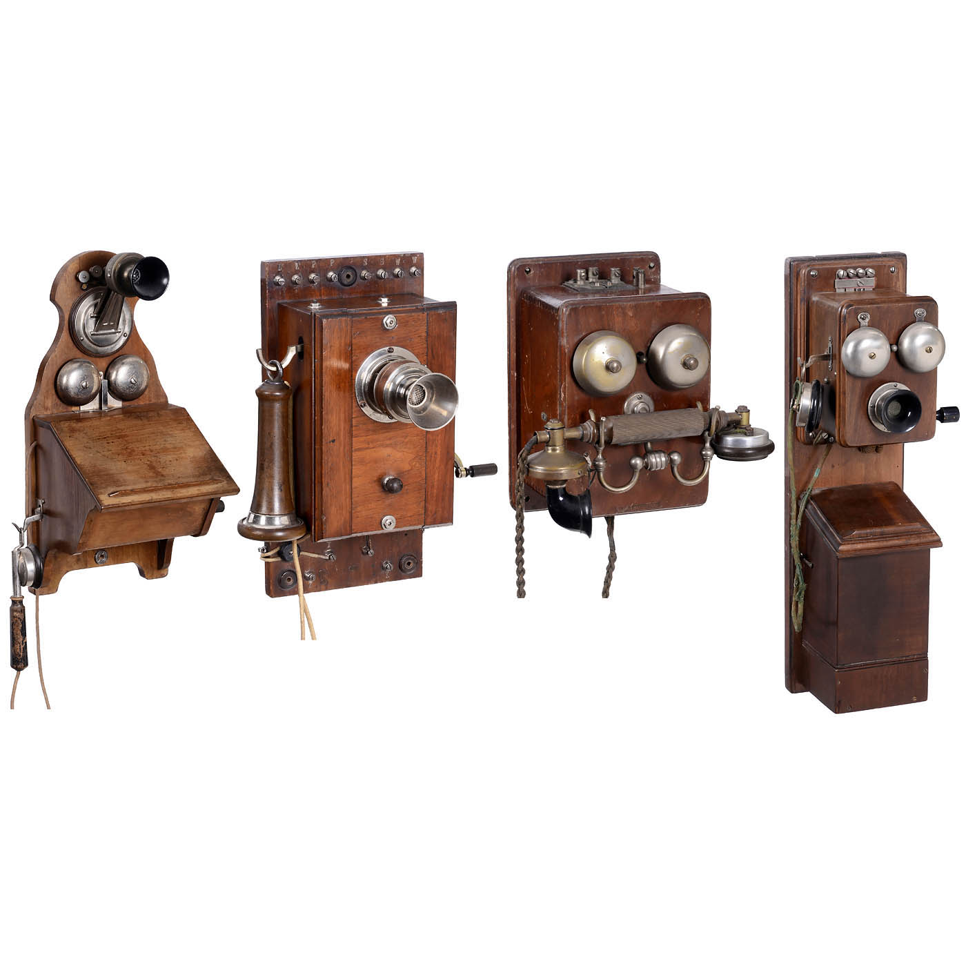 1) Friedrich Reiner, Munich. Marked on carbon-grain microphone and Bell-type receiver, walnut case, 3-part crank inductor. - 2) Unmarked, two-piece walnut case, 2-part crank inductor, double bell, can-shaped receiver, battery box with battery in glass container. - 3) Siemens & Halske, writing desk, 2-part crank inductor, double bell, movable microphone, spoon-shaped receiver. - And: 4) England, manufacturer unknown, mahogany case, 3-part crank inductor, double bell, nickel-plated cradle, handset with button and speaking horn, cradle and crank slightly bent.