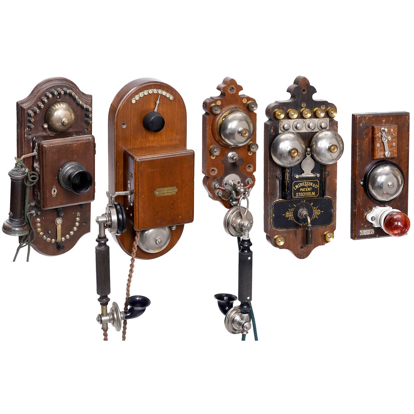 1) Extension switch no. 450, L.M. Ericsson, with sliding contact for two metallic circuits, double bell, with Ericsson transfer. - 2) British battery-ringing intercommunication wall telephone, for 10 single lines, single bell, handset with speaking horn. - 3) Two-line switch, British, with single bell and light bulb in porcelain mount. - 4) British intercommunication battery-ringing wall telephone, for 15 lines, carbon grain microphone with speaking horn, Bell-type receiver, single bell. - And: 5) Wall telephone for battery ringing, no. 405, L.M. Ericsson, single bell, handset with speaking horn.