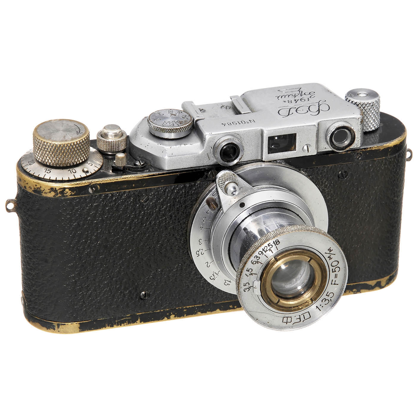 Unusual camera: the rangefinder cover is "Fed Zorki 1948 Nr. 01984", leather and body are Leitz, shutter works. With Fed 3,5/50 mm without number, on back engraved "0100" and "81 78". Previously disregarded subject of Leica replicas or Leica conversions.