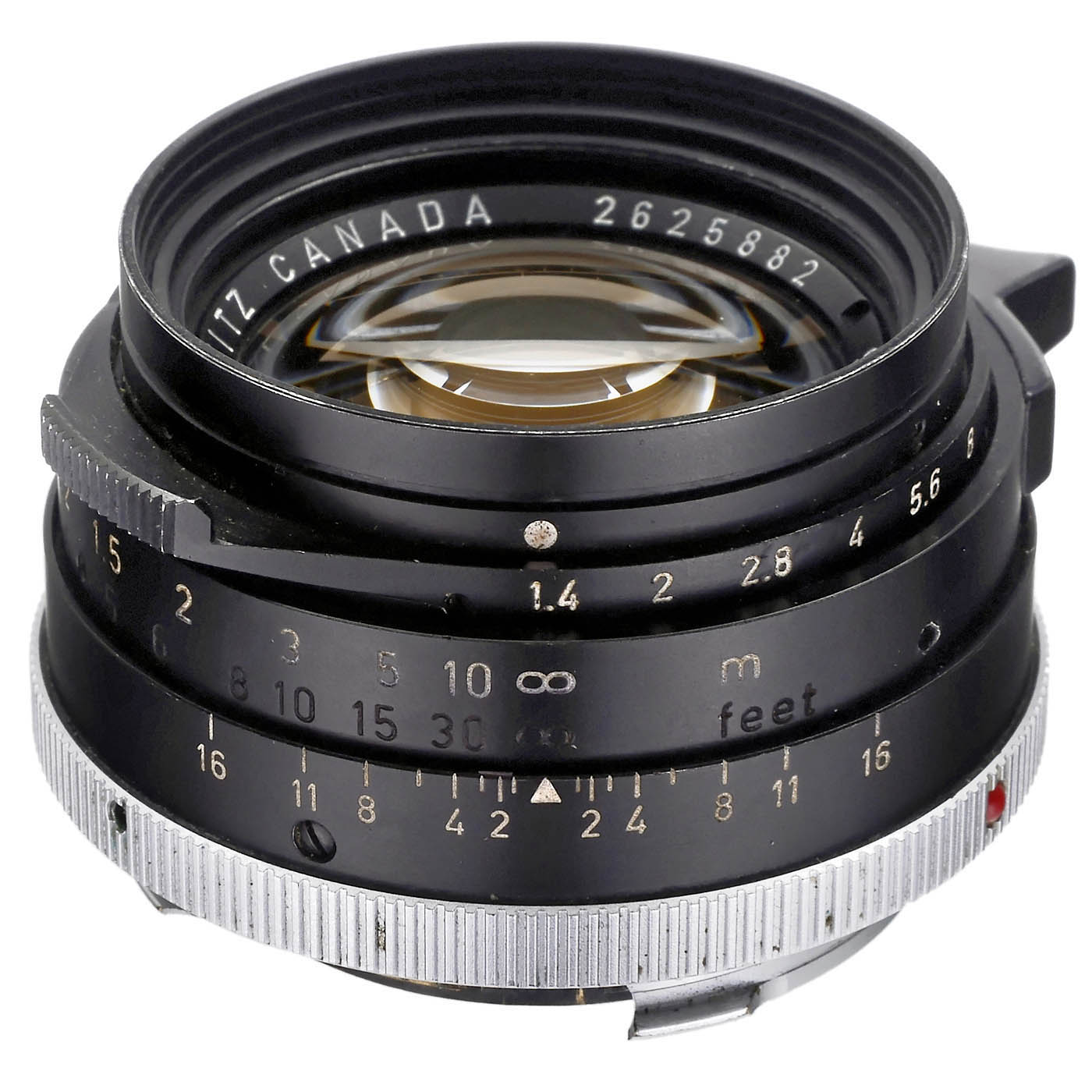 Leitz, Canada. No. 2625882. Three minimal spots (water residue from condensation?) on front element, glass inside clean. Lens attachment on bayonet mount shows 2/10 mm clearance, the feet engraving is without inlaid paint, otherwise normal condition.