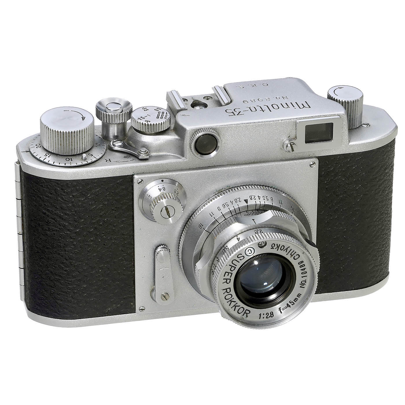 C.K.S. (Minolta, Japan). "Made in Occupied Japan", Minolta-35, type B or C, No. 8089. For 23,5 x 32,9 mm format. With Super Rokkor 2,8/45, No. 10489, glass clean, shutter curtains dry, longer shutter times a little bit clumsy, on the side a part of the leather missing, otherwise good condition.