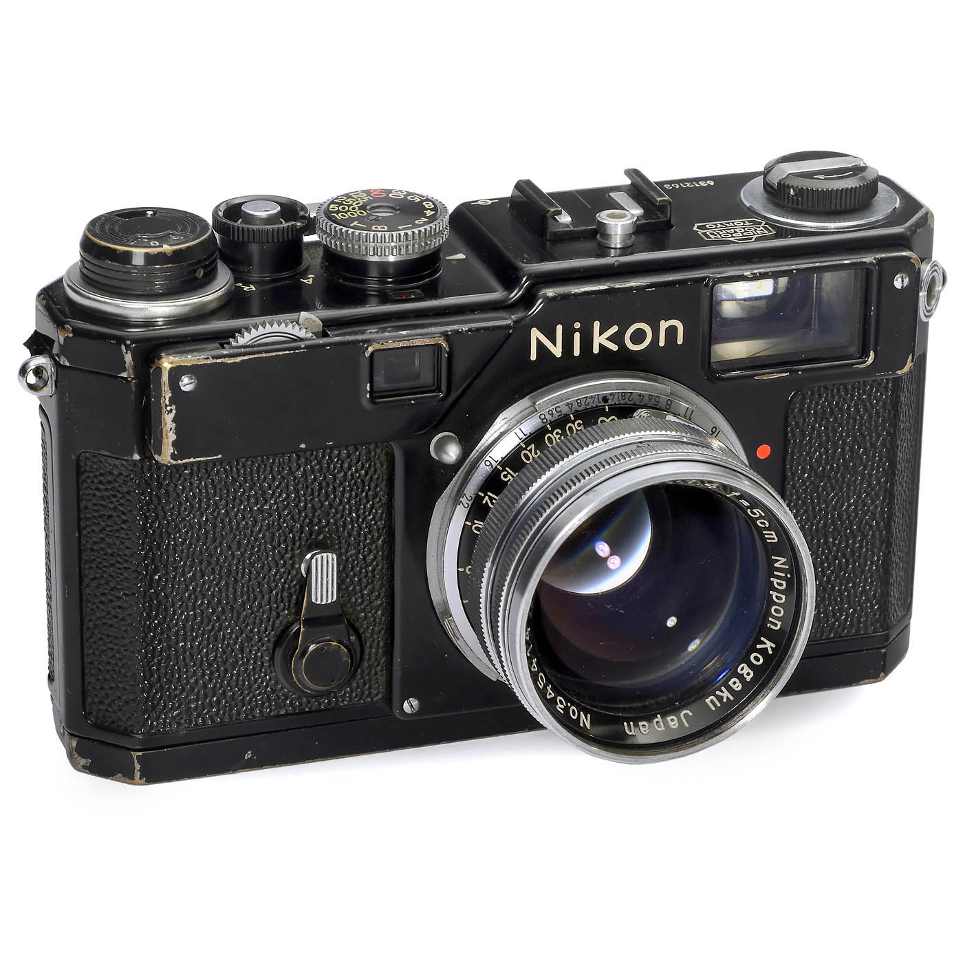 Nippon Kogaku, Japan. 1) Nikon S3 black, no. 6312163, in full working condition, body with user marks, on back a little dent. A camera for users! (4+/3+) - And: 2) Nikkor-S.C. 1,4/5 cm, no. 345414, glass inside clean, on front lens very weak cleaning marks. (2-3/3)
