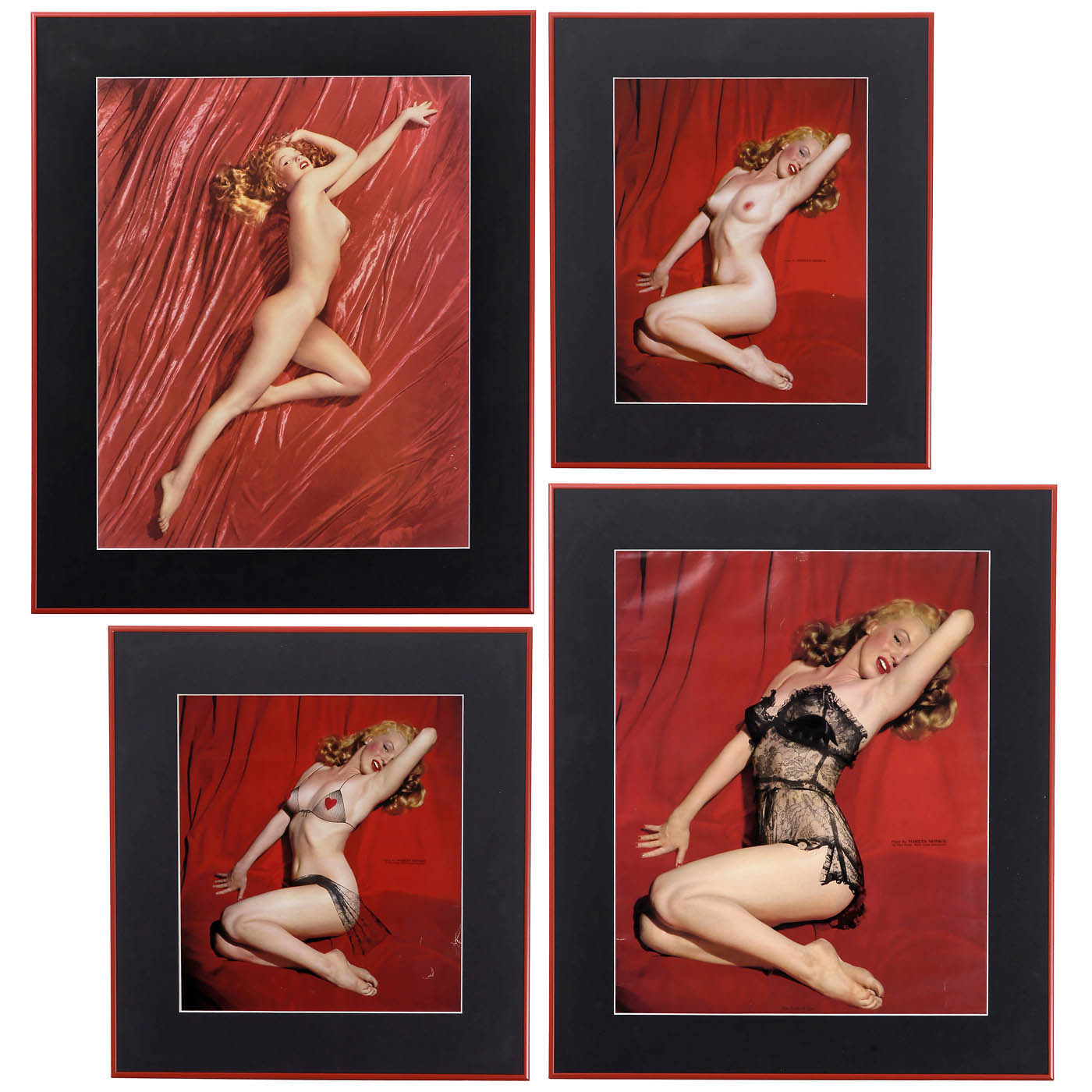 Nude photographs on red velvet, sitting and lying position, two of them with lace overprint (The Lace of Lure), dimensions with passe-partouts and frames 16 x 19 ⅓ in. and 21 ¼ x 25 ⅖ in.