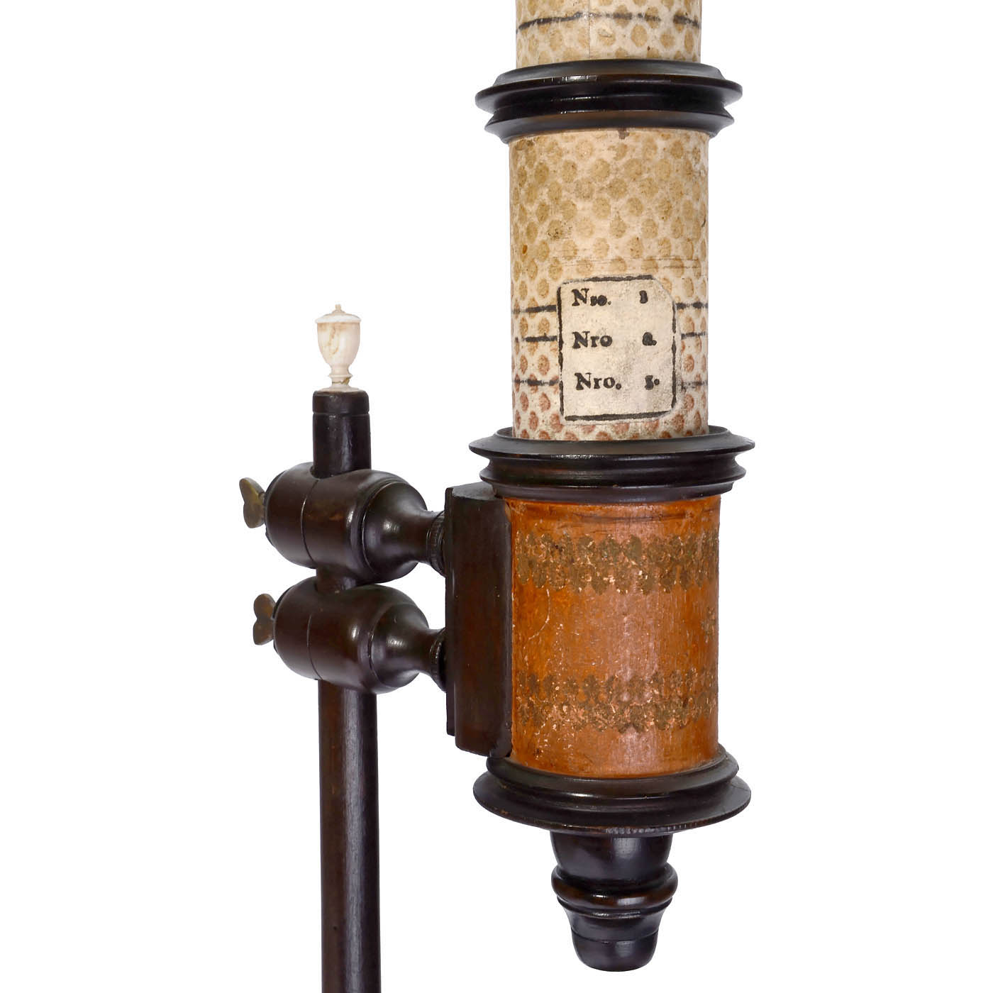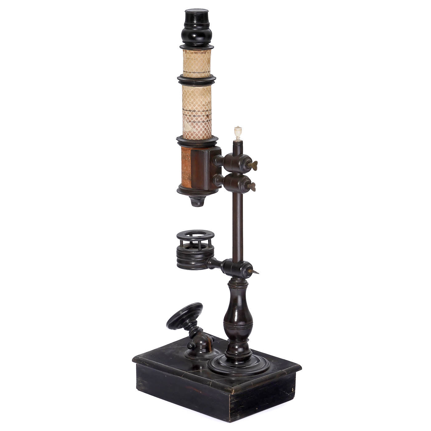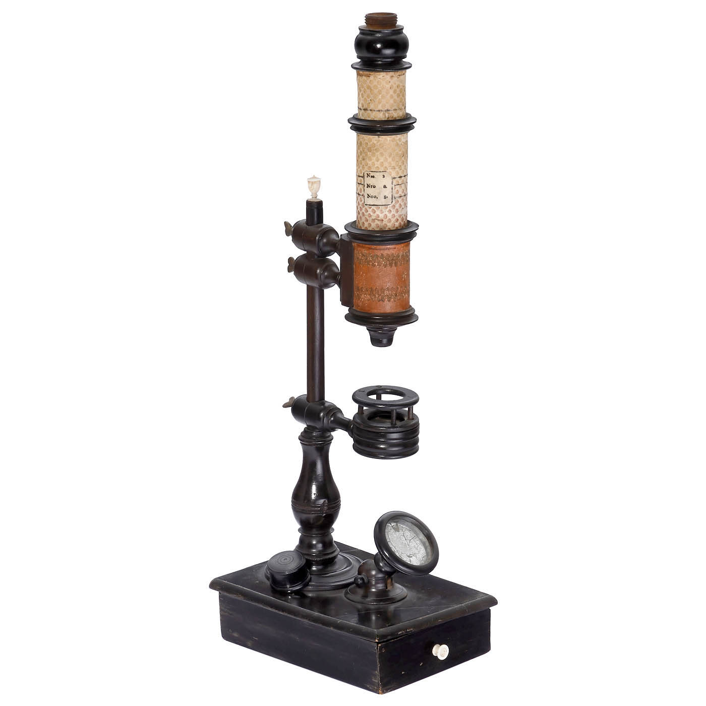 Ebonized wood, 5 x 7 in. rectangular box base with drawer, turned pillar with bone cap, 3 sliding arms for the stage and the tube with wrought wing screws, garland-and-star-embossed outer card tube, Ø 1 1/2 in., inner tubes with beige parchment, focusing dots, lines and designation "Nro 1, Nro 2, Nro 3", sliding tube coarse and fine adjustment, swiveling mirror in wood casing and base, with 1 bone specimen slider, extended height 20 ½ in. - Mirror matt, 3 slight cracks in the base. - An early and very rare microscope of Nuremberg production, in overall good condition.