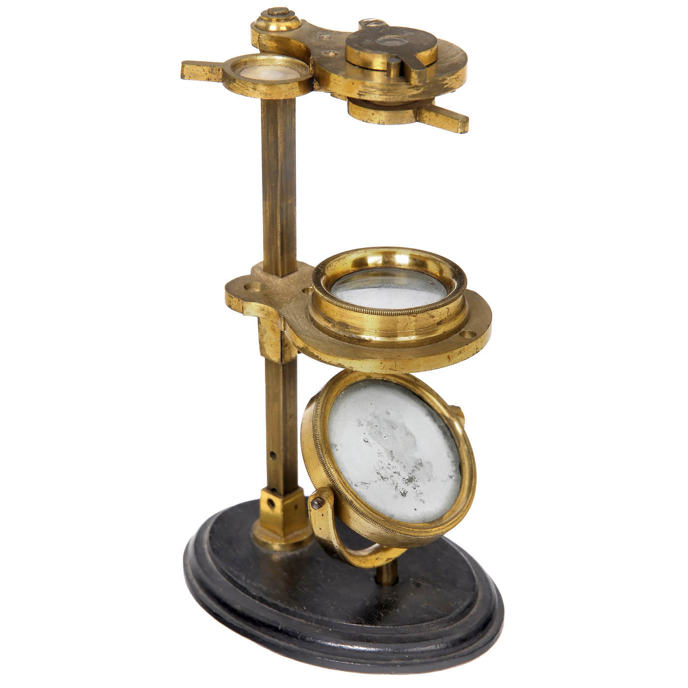 Unsigned, original lacquered brass, oval ebony baseplate with opening for the single mirror and brass mount for the square pillar, circular stage with sliding adjustment and openings for a glass plate, live box or stage forceps, top of the pillar with threaded arm holding three retractable lenses for use singly or in combination, height with base 4 in., with live box and bone specimen slide, in fitted black shagreen-covered wood case with green velvet lining.
